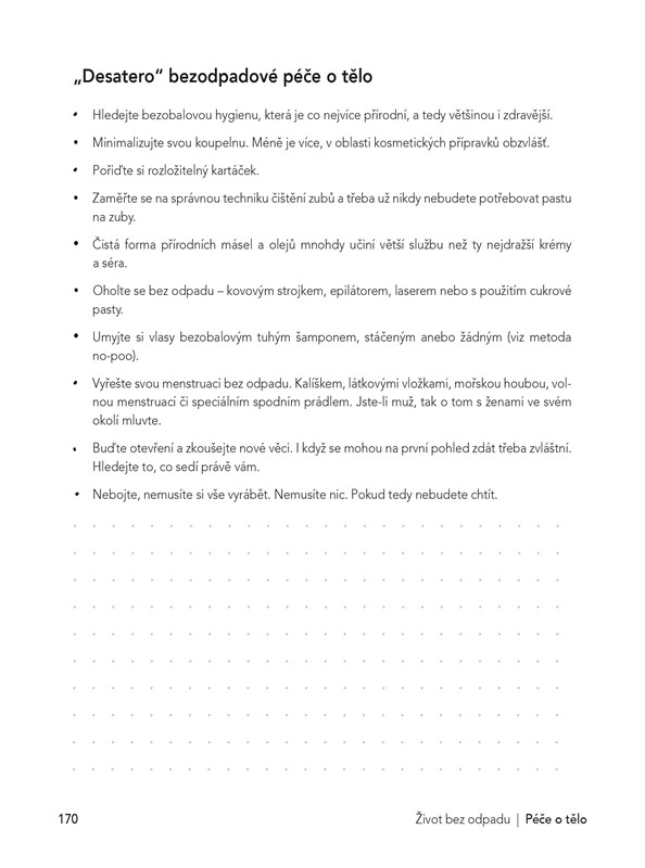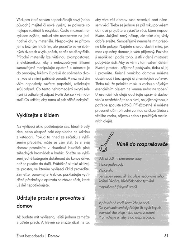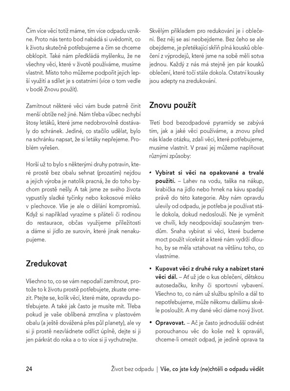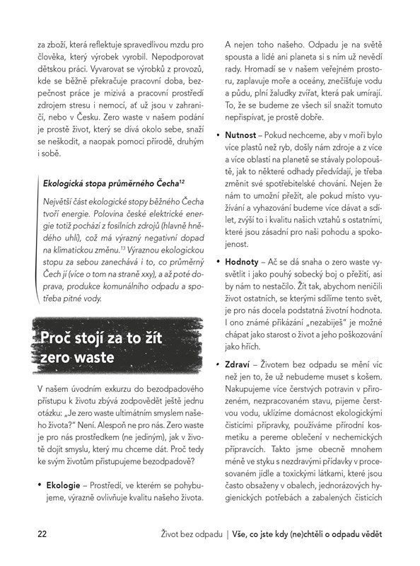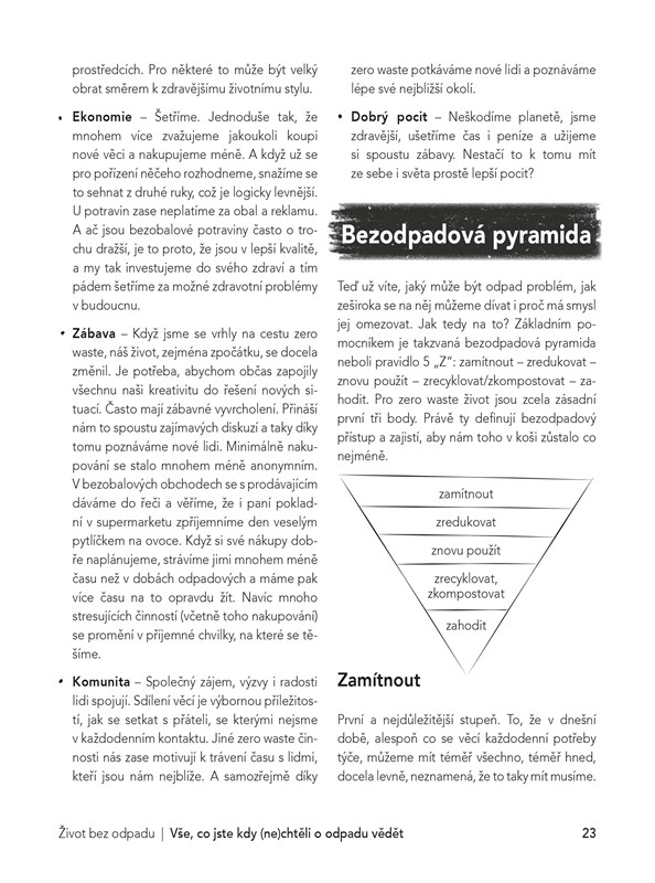 Je vůbec možné žít bez odpadu? Ano je! Tedy skoro. Jak na to vám představí trojice autorek, které založily známý blog Czech Zero Waste o životním stylu, který snižuje negativní dopad nejen na životní prostředí, ale i na lidi v našem okolí. Poradí vám, jak s životem bez odpadu začít, jak v praxi řešit některá bezodpadová rozhodnutí, jak přistupovat k běžným činnostem po vzoru zero waste – od úklidu, vaření, oblékání, až po cestování a život s dětmi.