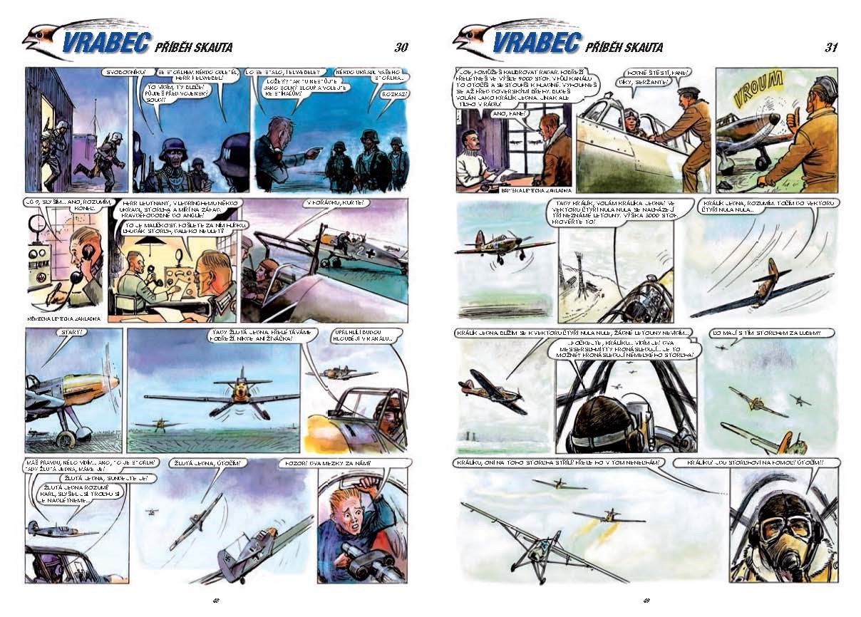 Legendární komiks Václava Šorela s názvem Vrabec o mladém skautu Janu Nováčkovi, který touží stát se pilotem a přispět za války k osvobození Československa, začal vycházet nejprve v časopise ABC. Nyní se po letech vrací v knižním vydání, ve kterém se čtenáři konečně dočkají celého a rozšířeného příběhu o dobrodružné a nebezpečné cestě českých letců přes Polsko a Francii až do Velké Británie, kde konečně svým umem a odvahou mohli přispět ke konečnému vítězství nad nacisty. Napínavý komiks o mladém hrdinovi je doplněn také řadou dobových fotografií a obrázků nejčastěji využívaných letounů.