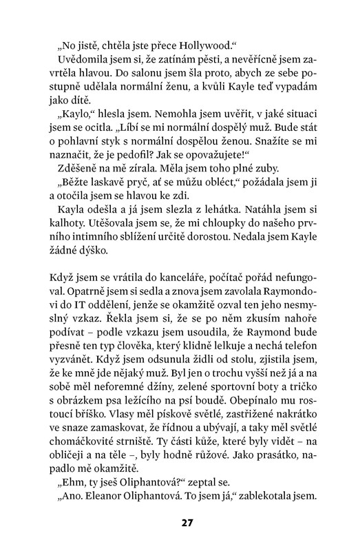 SvĂ©rázná, asociálnĂ Eleanor Oliphantová všechno zvládá sama. Vystudovala klasickou literaturu, ale pracuje jako účetnĂ a je jĂ ĂşplnÄ› jedno, co si o nĂ ostatnĂ myslĂ. S kolegy se snažà pĹ™Ăliš nekomunikovat, nikoho blĂzkĂ©ho nemá. Jizvy na obliÄŤeji a na rukou jsou vzpomĂnkou na otĹ™esnĂ˝ zážitek z dÄ›tstvĂ, se kterĂ˝m se nikdy nedokázala vypořádat, a radÄ›ji se proto utápĂ v alkoholu. KdyĹľ se seznámĂ s Raymondem z IT oddÄ›lenĂ, nejprve jej povaĹľuje za stejnÄ› obtĂĹľnou existenci jako zbytek lidĂ kolem sebe, postupem ÄŤasu jĂ však docházĂ, Ĺľe moĹľná našla skuteÄŤnĂ©ho pĹ™Ătele. Mnohem vĂc ji ale zajĂmá jejĂ novÄ› objevená láska – mĂstnĂ zpÄ›vák Johnnie Lomond. Ten o existenci svĂ© obdivovatelky zatĂm nemá ani tušenĂ, ovšem Eleanor zaÄŤne spřádat rafinovanĂ˝ plán, jak jej zĂskat…