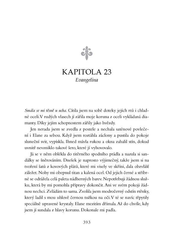 Ve světě Stříbrných a Rudých vládne zmatek. Mare zůstává v zajetí, zbavená svého blesku a mučená vlastními chybami. Přežívá jen díky milosti nového krále – kluka, jehož kdysi milovala, ale nakonec se z něj vyklubal lhář a zrádce. Maven Calore pokračuje v pletichách své mrtvé matky a snaží se získat moc nad celou zemí i nad svou zajatkyní. Zatímco Mare v paláci trpí pod účinky tichého kamene, její kdysi ubohá skupina novokrevných a rudokrevných se organizuje, cvičí a nabírá nové členy. Připravují se na válku, protože už se nechtějí skrývat ve stínu. A Cal, vyhnaný princ, který také usiluje o lásku blýskající dívky, se nezastaví před ničím, aby ji vysvobodil. Krev se obrací proti krvi a schopnost proti schopnosti. Hrozí, že nakonec nezůstane nikdo, kdo by vznikající požár uhasil, a z Norty, jak ji Mare zná, zůstane jen černé spáleniště.