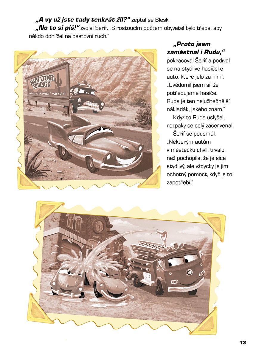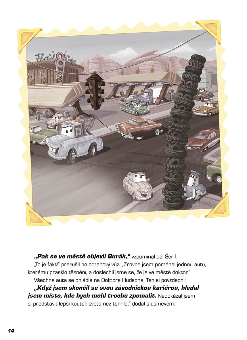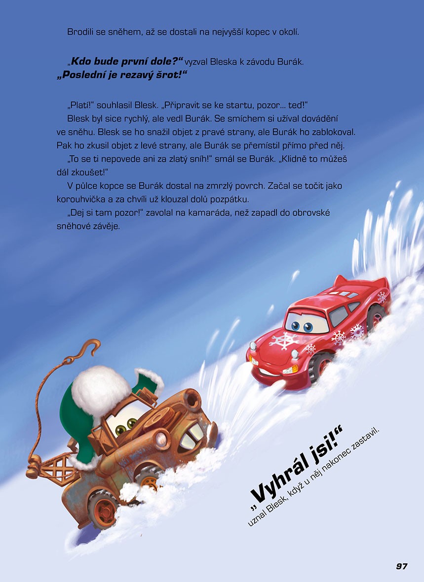 Chtěli byste si změřit rychlost se slavným závoďákem Bleskem McQueenem nebo se vypravit s jeho nejlepším kamarádem, odtahovým autem Burákem, do dobrodružné akce jako špioni? Tato kniha na motivy oblíbených animovaných filmů vás přenese nejen do světa závodění na rychlých kolech, ale také do klidného městečka Kardanová Lhota, kde našel Blesk svůj domov, nejbližší přátele a dobrého učitele.