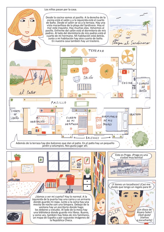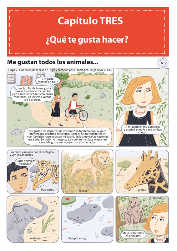 Úvodem každé kapitoly je komiks s hlavními postavami knihy. Díky komiksovému zpracování se děti seznámí s novou slovní zásobou a gramatikou. Představují se v něm také některé španělské reálie, o kterých je již v českém prostředí povědomí. Po komiksu následuje slovníček, stručné vysvětlení gramatiky a cvičení.
