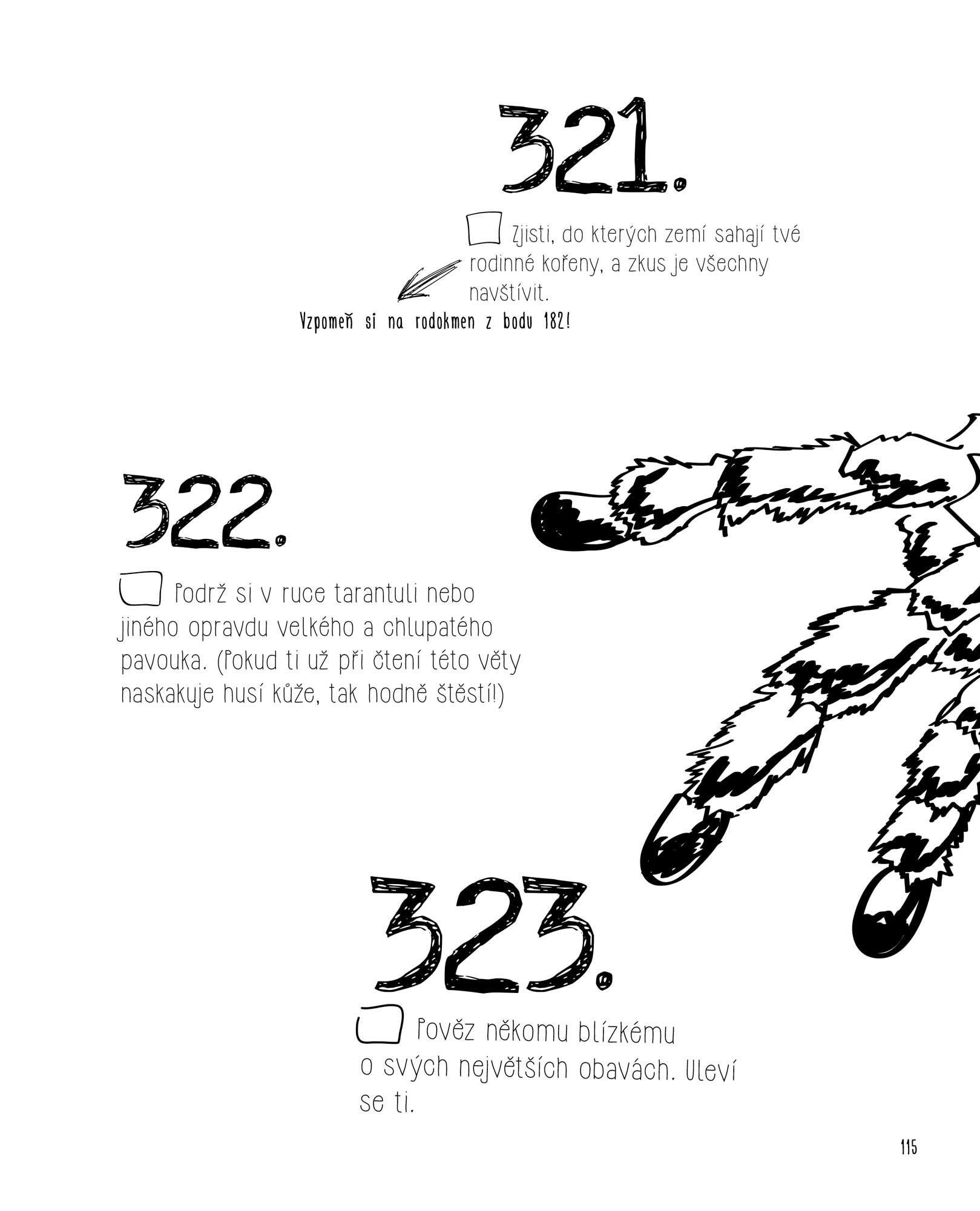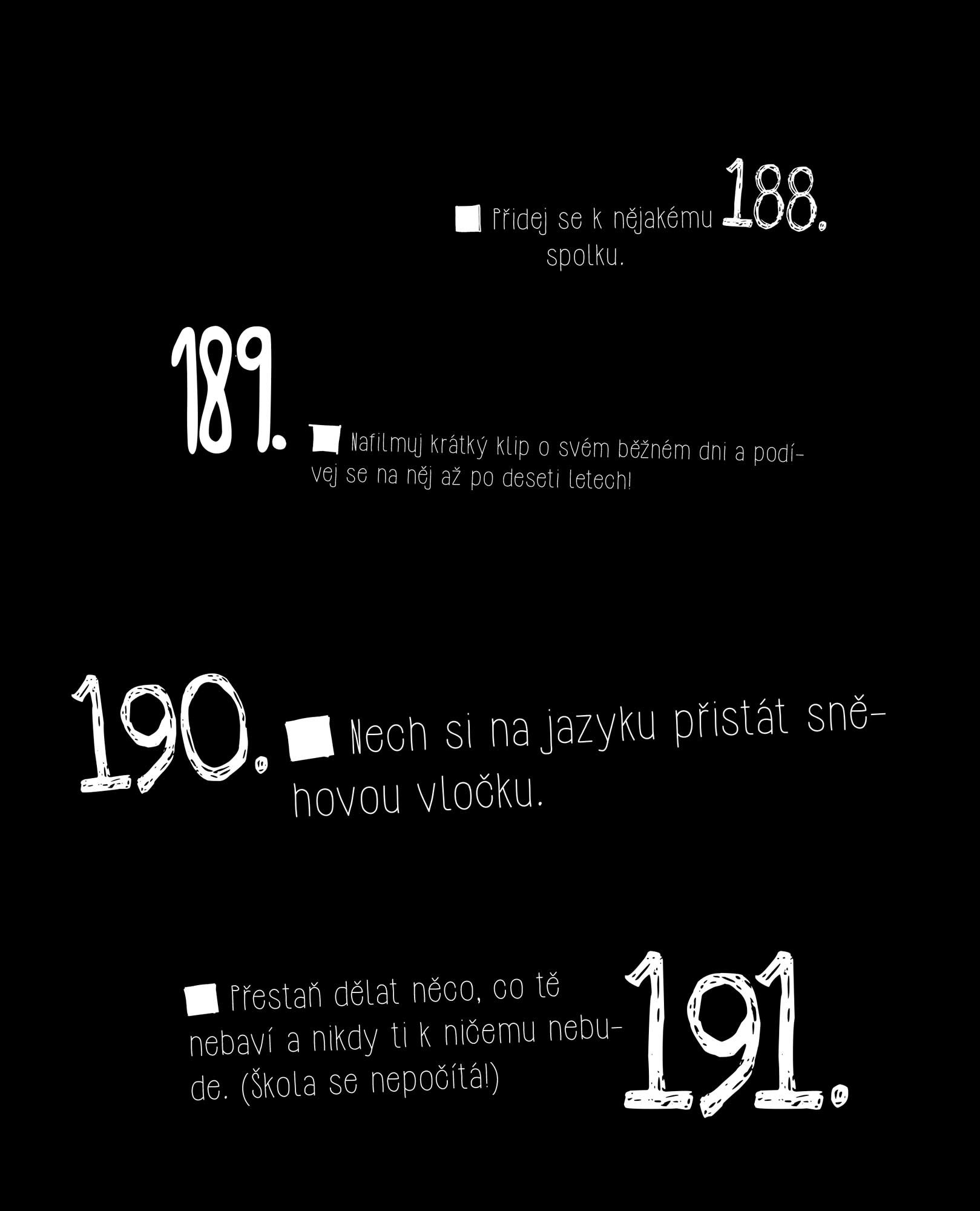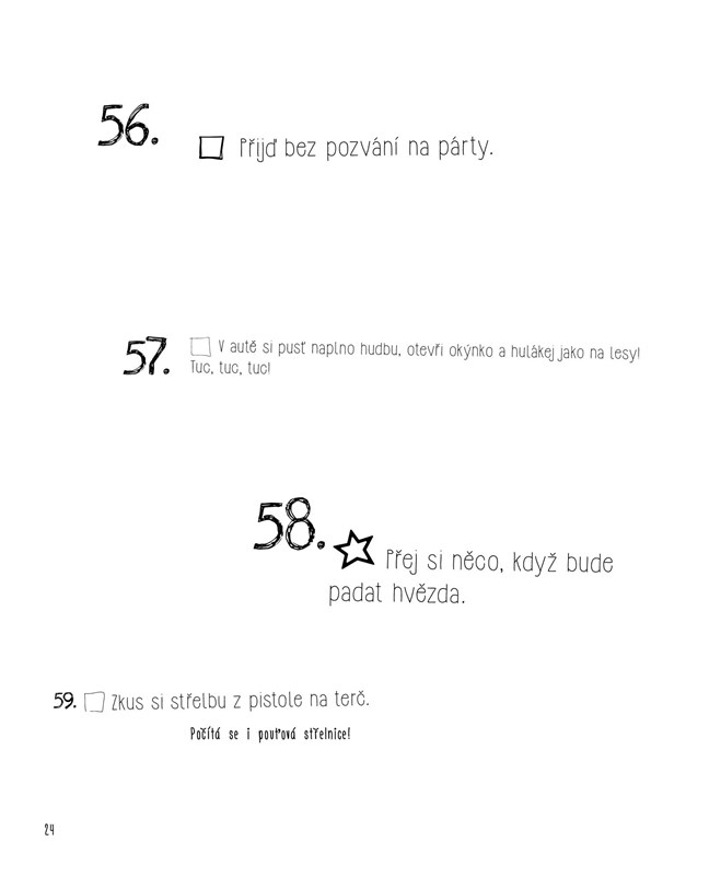 Všední dny se opakují a často je to nehorázná nuda: vstaneš, jdeš do školy, vrátíš se domů, sedneš k televizi nebo počítači, uděláš úkoly a jdeš spát. Pořád dokola. Přitom toho okolní svět tolik nabízí! Že nevíš co? Vyfoť se s exotickým zvířetem, zajdi si do letního kina, skoč do bazénu v oblečení nebo se zkus dostat do Guinessovy knihy rekordů. Nenajdeš tu návody, jak žít, jen spoustu inspirace a nápadů. Uvidíš, jak tě bude bavit odškrtávat si políčka a jakou budeš mít z každého nového zážitku radost.