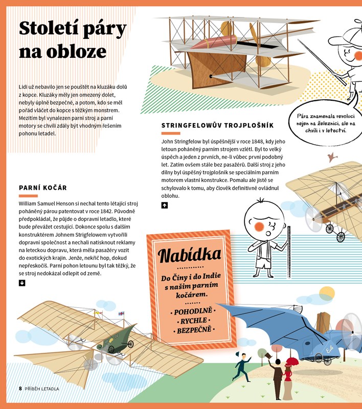 Kniha vypráví příběh létajícího stroje od prvních průkopníků a pionýrů letectví až po moderní letouny s hypersonickým pohonem.