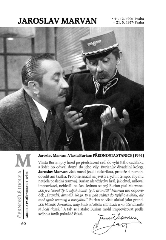 Černobílé idoly tentokrát nesou podtitul „abeceda pamětnických hvězd“. Nečekejte však žádná nudná slovníková hesla, žádná suchopárná životní data, ale opravdu čtivé a zajímavé medailonky! Díky autorově dlouholetému pátrání v archivech či rozhovorům s příbuznými slavných legend a řadou pamětníků se opět můžete dozvědět mnohé ze života desítek vašich oblíbenců. Součástí této knihy jsou i úsměvné a peprné vzpomínky Luby Skořepové na kolegy z Národního divadla.