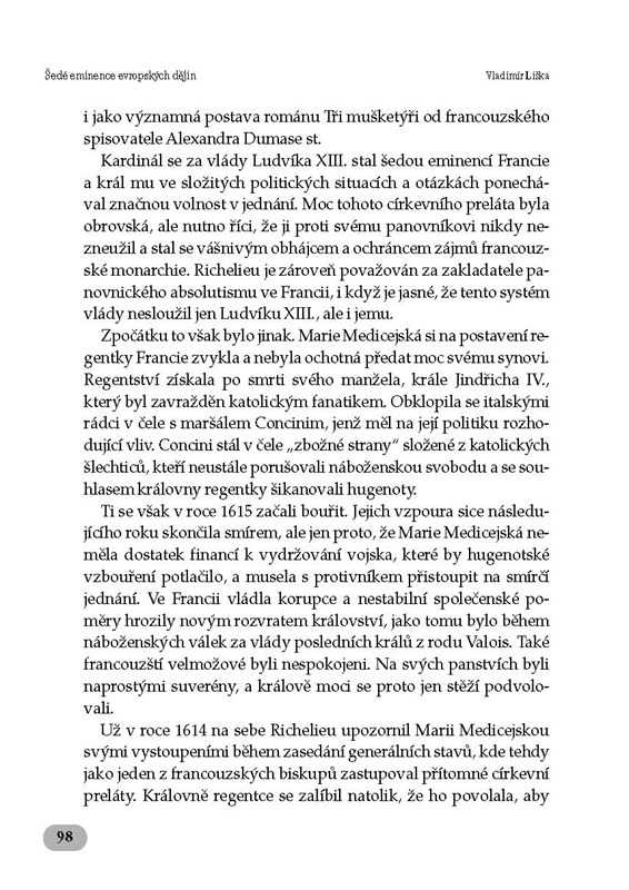 Tato kniha nabízí zúžený výběr historických postav, které na sebe v běhu dějin výrazně upozornily právě tím, že se staly šedými eminencemi, a pro svá životní dramata, která díky tomu prožily, se jejich jména trvale zapsala do historické paměti. S jejich jmény se pojí dobro i zlo, často dokonce obojí, neboť se většinou jednalo o vcelku kontroverzní osobnosti. Tak už to bývá – dějiny totiž nelze nahlížet skrze černobílé prizma a pro ty osobnosti, jež je pomáhaly spoluvytvářet, to platí dvojnásob. Z jejich životních osudů můžeme dnes čerpat jisté poučení, neboť poučení z dějin nám i v současnosti často chybí…