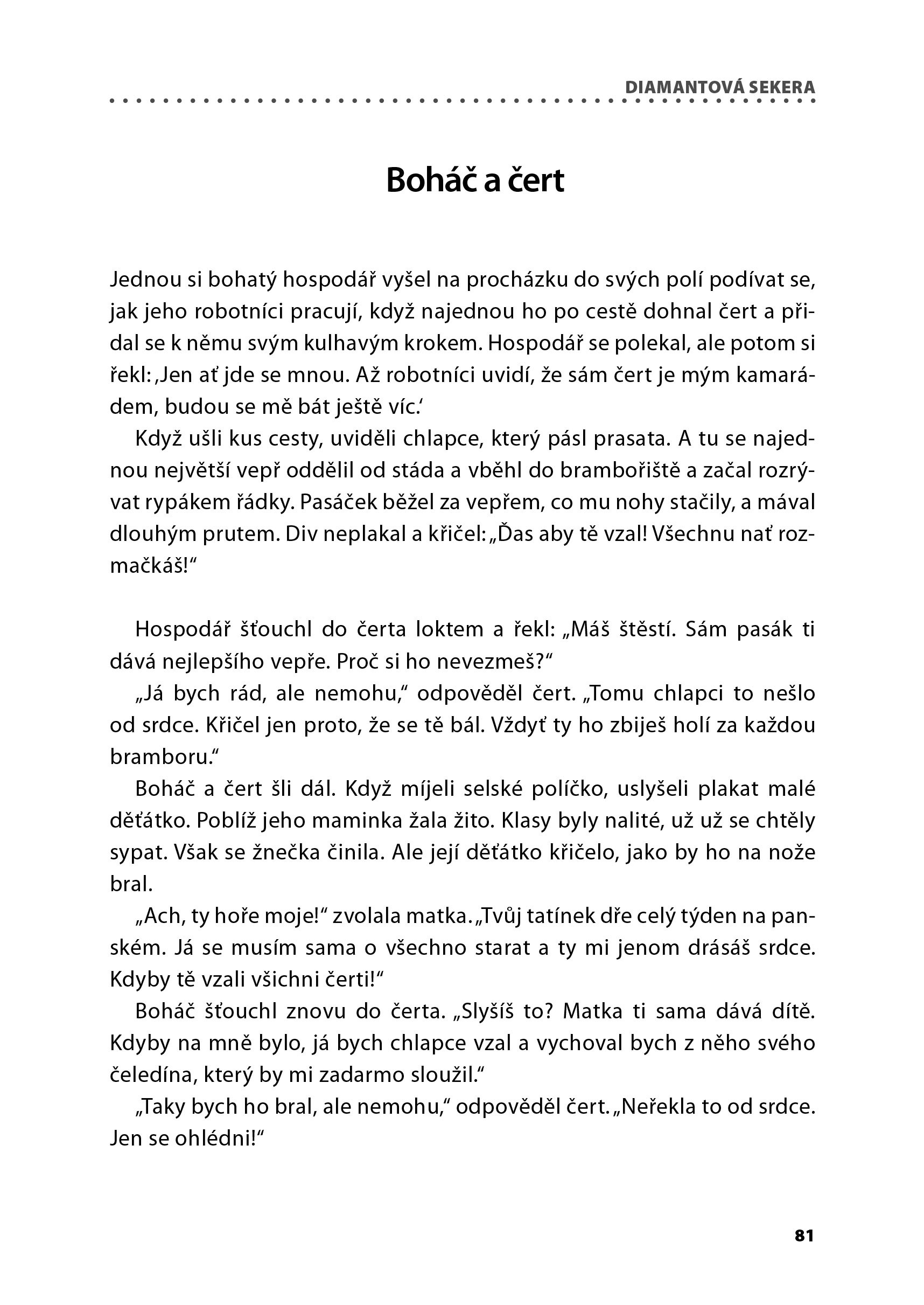 Kniha Jaroslava Tichého Diamantová sekera se dočkala mnoha vydání a už se dávno zařadila mezi klasické pohádkové sbírky. Tyto kouzelné pohádky pocházejí z pobaltských zemí. Je v nich uložena lidová moudrost, důvtip a často také ironie. V postavách Diamantové sekery můžeme vidět podobnost s postavami našich národních pohádek. V obou typech pohádek se setkáváme s lakomými boháči a pracovitými chuďasy, se zlými selkami a statečnými vojáky, s čerty, kteří touží odnést do pekla chamtivé pány...