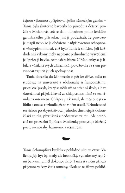 V montrealské Bukové ulici, v bistru U Madlenky pracuje půvabná dívka Tania. Víří mezi stoly jako tanečnice a hosté ji mají rádi. Jen ten, do nějž je potají zamilovaná, jako by ji snad ani neviděl. Plachý pošťák Bilodo, pohroužený sám do sebe, krouží u baru kaligrafické tahy a skládá japonská haiku... Až jedné bouřlivé noci zasáhne jejich životy událost, jež všechno změní. Jejich osudy se nerozlučně propletou a oba vstoupí do světa, kde nic není takové, jak se zdálo.