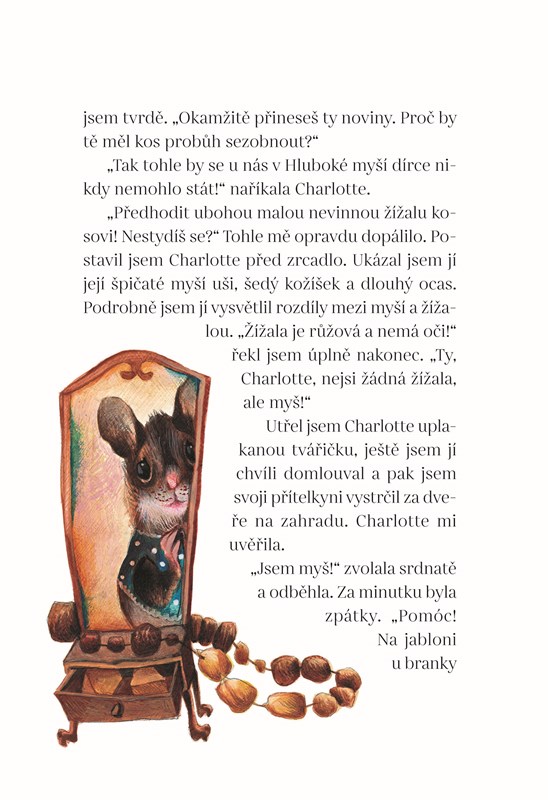 Petr Chudožilov, povídkář, fejetonista, esejista a autor pohádek, jehož dílo bylo oceněno Čestnou listinou IBBY a prestižní Evropskou cenou za nejlepší německou pohádku, se vrací i k těm nejmladším českým čtenářům s nesentimentálně poetickou knížkou, která vychází v překladu samotného autora po dvaceti letech od prvního vydání v německém jazyce. Nenápadná myší kamarádka Charlotte dovádí pana spisovatele často doslova k zoufalství, prožili spolu doslova neuvěřitelné věci. Vždycky ví všechno nejlíp a na všechno má odpověď. Smysl pro fantaskno uplatnil Chudožilov nápaditým a hravým způsobem a zázračné dění vpadá do světa nepohádkové každodennosti.