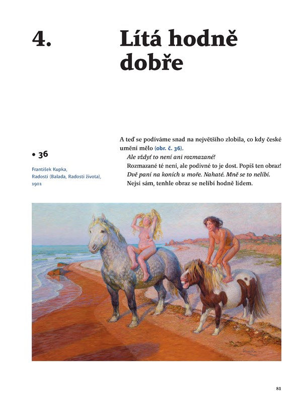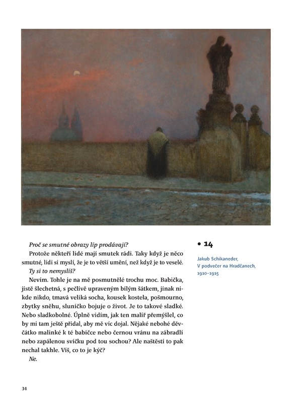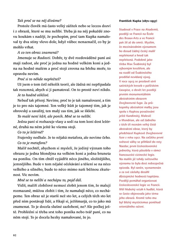 Průvodce světem výtvarného umění pro malé i velké. Kniha je určena těm, kteří si chtějí s dětmi povídat o výtvarném umění. Naučit je dívat se na obrazy a sochy bezprostředně, bez přehnaného respektu i strachu z neporozumění. Aby si z každého setkání s výtvarným dílem dítě odneslo to, co si odnést může a dovede. Není důležité, aby hned vědělo, kdo a kdy daný obraz namaloval, je důležité, aby vědělo, proč je třeba zvláštně rozmazaný. Kniha je průpravou ke zdravému vztahu k umění.