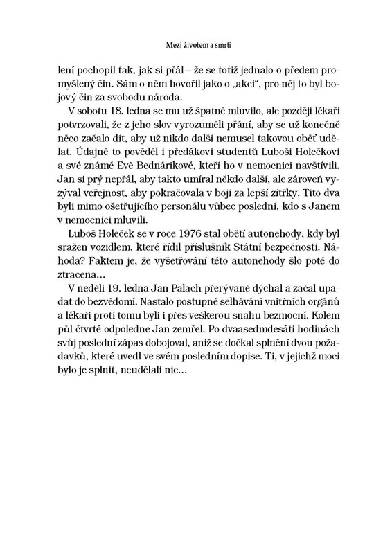 Janovy smysly otupila šílená bolest, prostupující celým jeho ležícím tělem. Nevnímal křik ani paniku kolem sebe. Někdo zavolal záchranku a on jen stačil popálenými ústy tiše vyslovit pár vět o tom, aby si lidé přečetli dopis, který nechal u fontány před Národním muzeem v aktovce. Potom se celý svět rozplynul v mlze…