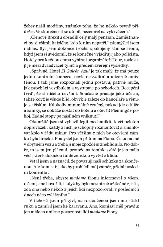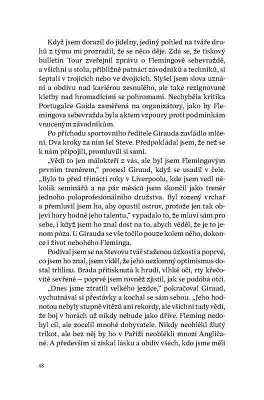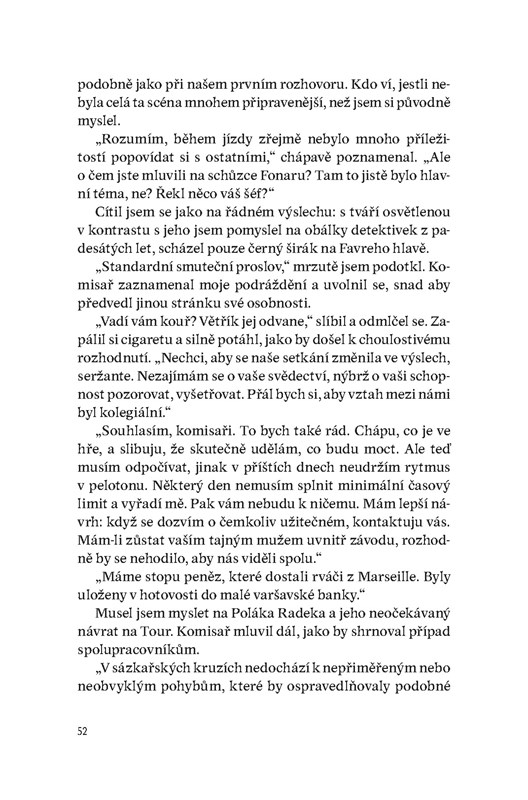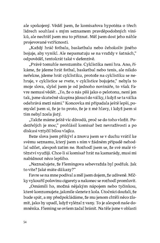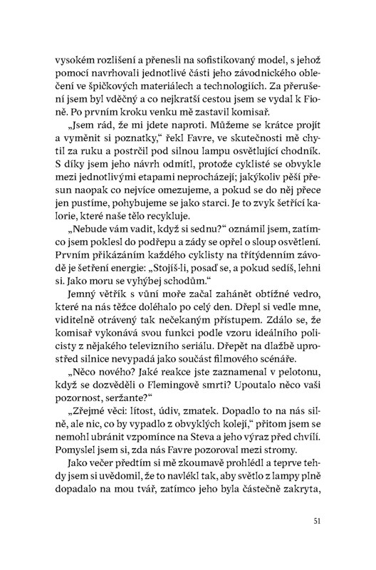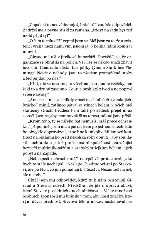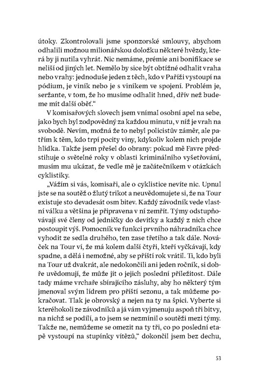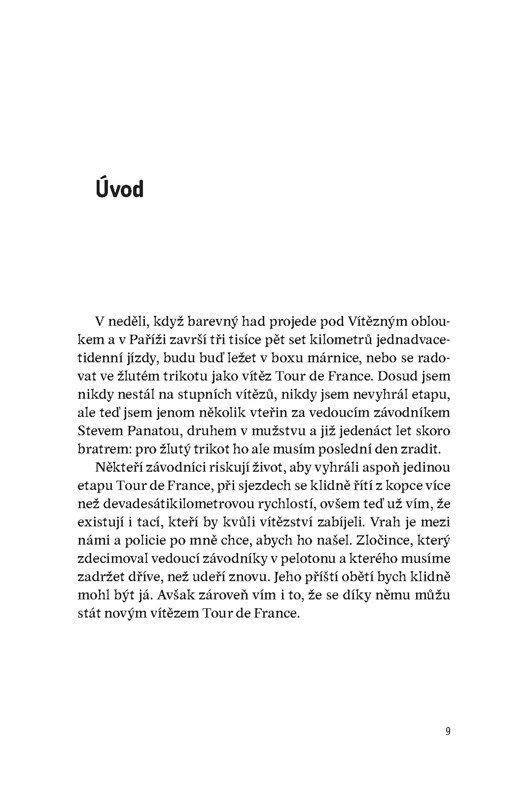 „Někteří závodníci riskují život, aby vyhráli aspoň jedinou etapu Tour de France, při sjezdech se třeba řítí z kopce více než devadesátikilometrovou rychlostí, ovšem nyní vím, že jsou i tací, kteří by kvůli vítězství i zabíjeli.“