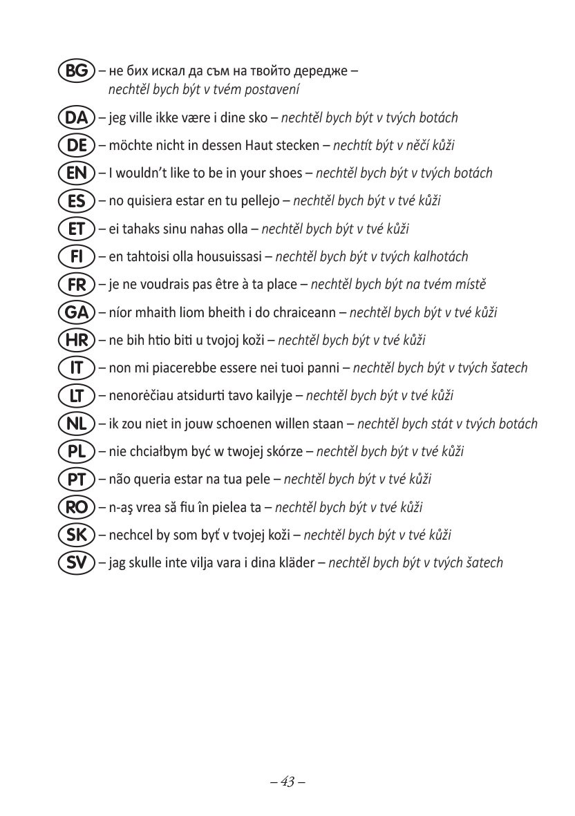 Autor knihy si tu práci dal a k českým idiomům vyhledal nejbližší ekvivalenty v oficiálních jazycích Evropské unie. Výsledkem je tato originální humorně-naučná knížka, která nejen pobaví, ale především umožní osvojit si mnoho zajímavých idiomů a proniknout tak lépe do studia cizích jazyků.