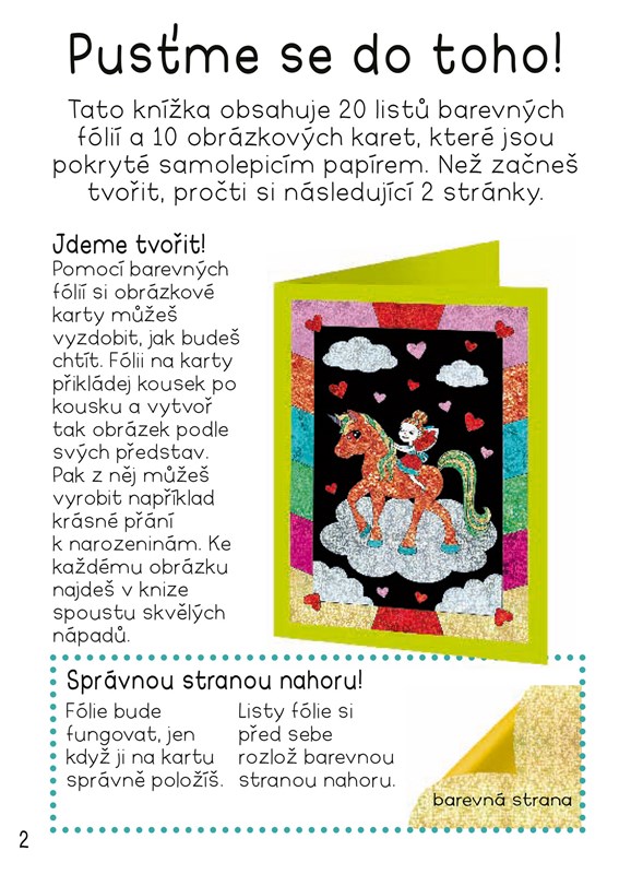 Knížka s obálkou obsahuje 20 listů barevných fólií a 10 samolepicích obrázkových karet. Pomocí postupného přikládání barevných fólií si obrázkové karty můžeš vyzdobit dle své fantasie, a pak z nich vyrobit například krásné přání k narozeninám, originální obal na tajný deníček či ozdobnou cedulku na dveře svého pokojíčku. Ke každému obrázku totiž najdeš v knize spoustu skvělých nápadů.