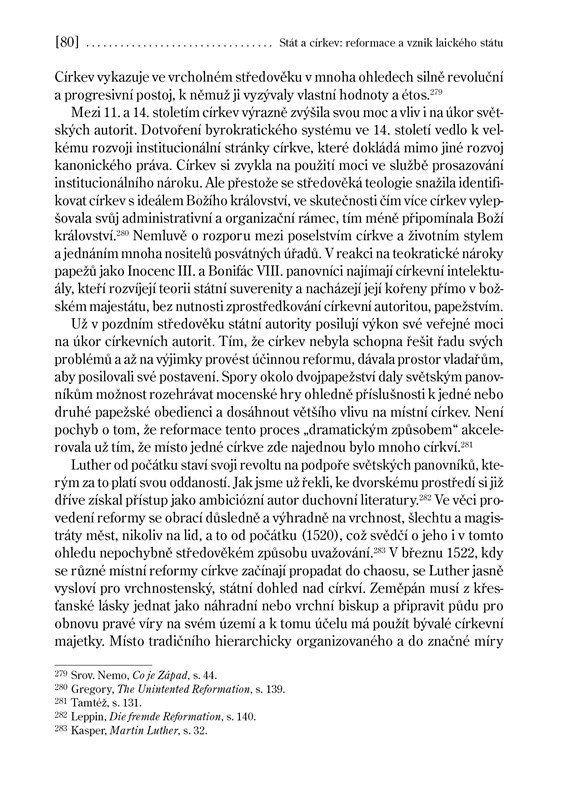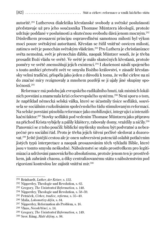 " Výročí pěti set let od počátku reformace je příležitostí nabídnout velkorysý pohled na příběh novověkého a moderního křesťanství, nakolik byl určen právě epochálními náboženskými událostmi 16. století. Autor v prvních třech „tezích“ rozebírá stav západního křesťanstva okolo roku 1500, důvody revolty Martina Luthera a jeho úspěchu a rovněž otázku, zda byla šance na zabránění rozdělení církve. Koriguje přitom řadu často samozřejmě sdílených klišé. Těžiště knihy leží však v dalších pěti kapitolách-tezích. V nich rozebírá paradoxní a dalekosáhlé dopady Lutherovy reformace na západní křesťanství jako celek: Prohloubené pokřesťanštění společnosti, ale zničení dobrého jména náboženství a vzájemným vymezováním deformovaný vývoj všech větví západního křesťanství; vytvoření dokonalejší církevní organizace, provázené však ztrátou schopnosti utvářet jednotný hodnotový rámec a vnášet civilizační impulsy do západní společnosti; narušení vztahu mezi náboženstvím a vědou; jednostranné vychýlení rovnováhy mezi státem a církvemi; chápání náboženské nenávisti jako ctnosti a součásti vlastní konfesní identity atd. Kniha má svým charakterem široký přesah, není zbytečným pokusem o rekapitulaci vzniku a povahy konfesijních střetů. Spíše nabízí socio-kulturologickou esej psanou z této perspektivy a představuje možnost, jak promyslet a pochopit historické kořeny současného vývoje západní společnosti a jejího vztahu k církvím a náboženství. Díky předmluvě biskupa Václava Malého a obsáhlému doslovu prof. Karla Skalického se k fenoménu reformace vyslovují tři generace českých katolických intelektuálů. "
