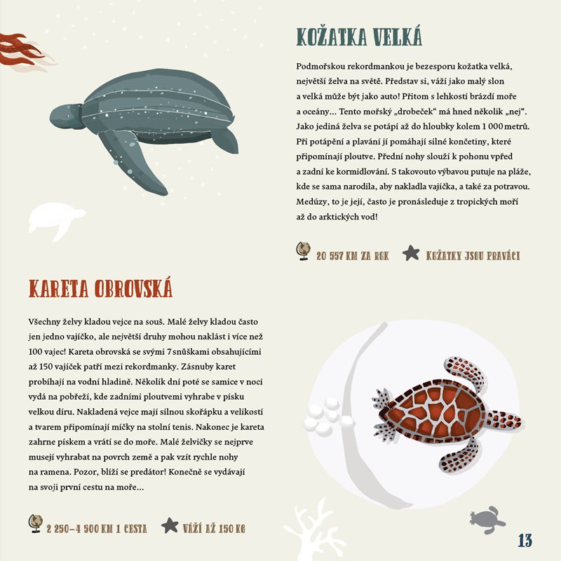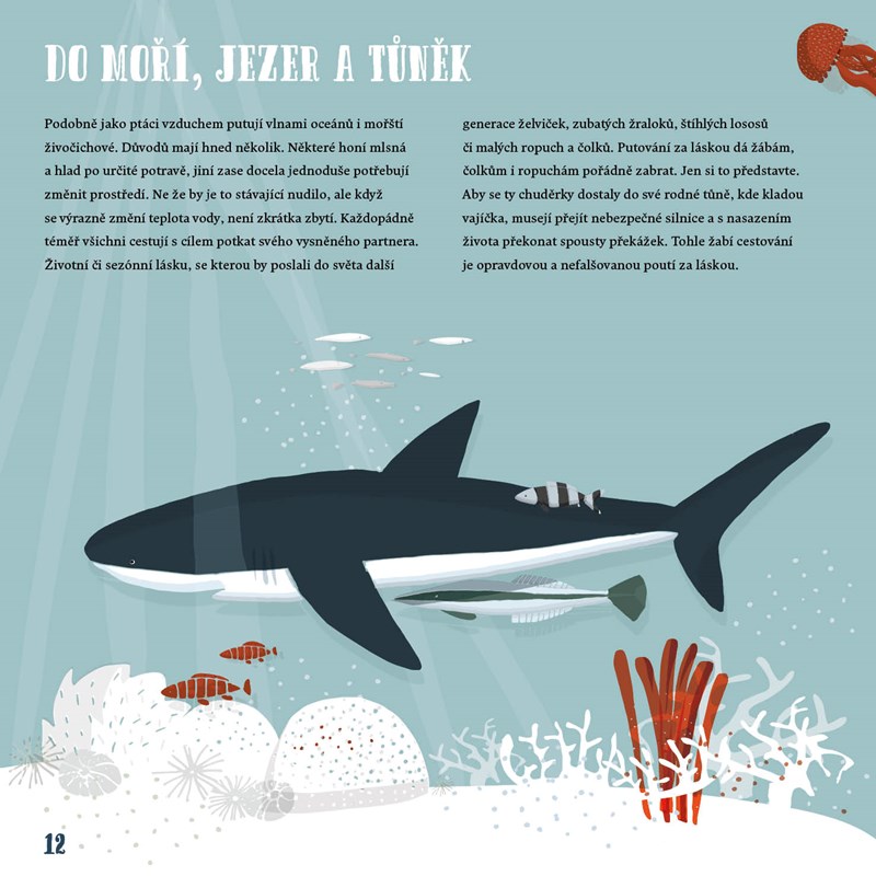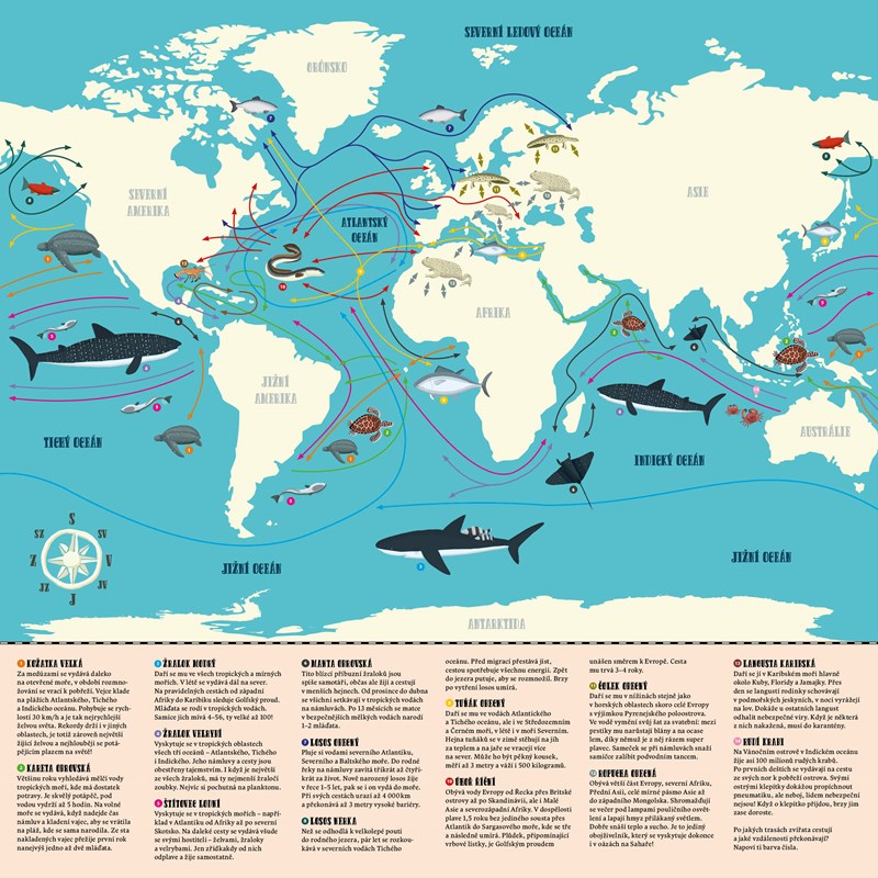 Některá zvířata se za celý život nepodívají dál než za humna, ale jiná procestují kontinenty… Třeba takový rybák dlouhoocasý, malý pták s červeným zobáčkem a nožičkami, každý rok obletí celou zeměkouli! Kareta obrovská si zase elegantně pluje přes moře a oceány, aby se podívala na místo, kde se kdysi narodila. Právě tam a nikde jinde naklade kulatá bílá vajíčka, z nichž se vylíhne spousta malinkých karet obrovských. Jen co želvičky vykouknou na svět, hned se rozutečou široko daleko. A víte vy vůbec, proč putují stáda afrických slonů nebo třeba sob? Že ne? Tak se pojďte rychle podívat! Ze stránek knihy na vás dýchne vůně exotických dálek. Součástí publikace jsou tři velkoformátové mapy, z nichž se čtenář dozví, po jakých trasách zvířata cestují a jaké vzdálenosti překonávají.