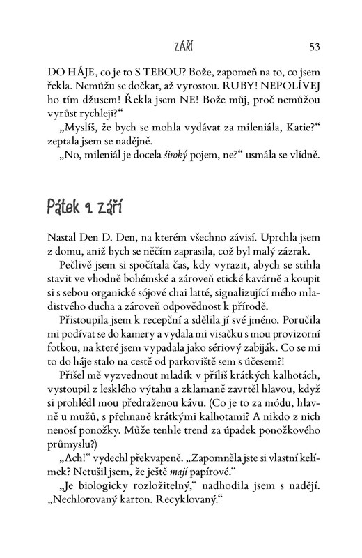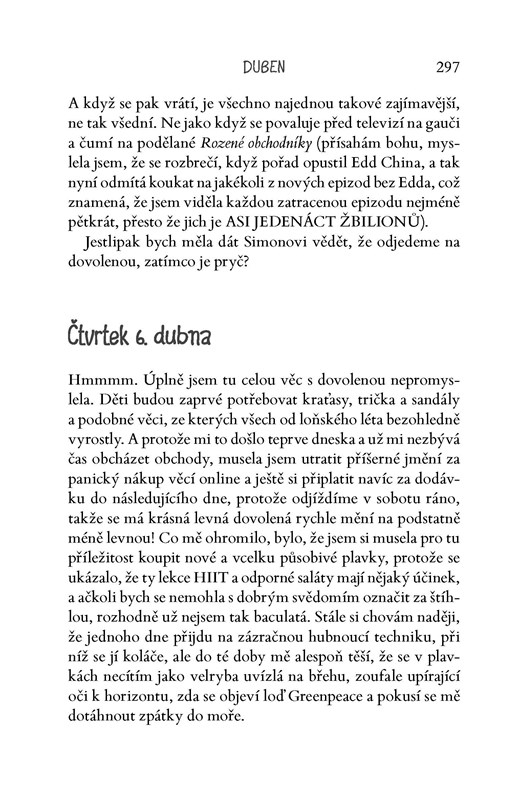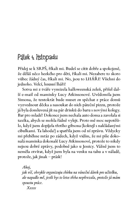 Jako by toho nebylo málo, máma si našla novou životní výzvu – práci pro čerstvě rozjetou firmu plnou mladých a nadějných lidí, což jí mimo jiné přináší starosti, jestli ve svých čtyřiceti dvou letech zvládne vstát ze sedacího vaku s potřebnou důstojností a zda jí projde, když si do práce obleče kalhoty připomínající tepláky. V novém prostředí se také nějak (omylem) uvedla jako svobodná večírková královna, která nemusí běhat domů za dětmi, a teď neví, jak z toho ven, aby se naprosto neznemožnila…
