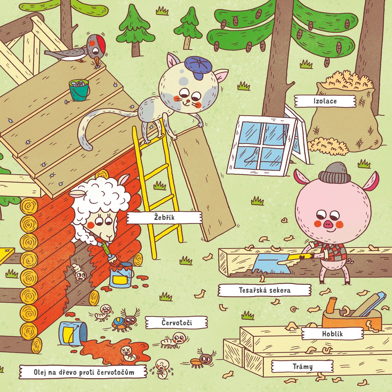 Tři prasátka si chtěla postavit domeček. Ale jak se vlastně takový domeček staví? Oblékni si montérky a podívej se, co všechno prasátka potřebovala: jeřáb, bagr, krumpáč, nákladní auto, cihly, zednickou lžíci… Kdo jim pomáhal a jakou zvláštní věc našla prasátka hluboko v půdě? To se dozvíš v této knížce.