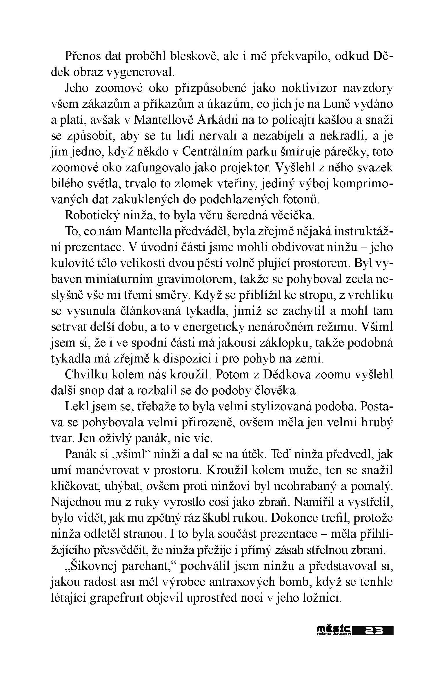 Příběhy Kuby Nedomého a Dědka Čucháka začaly v románu Měsíc mého života. V lunárním habitatu Arkádie vedou skromné živobytí starožitníků, člověk vedle kyborga. Mohli by žít docela poklidně, nebýt jejich všetečnosti, která je vede do střetu s mocnými toho podivného světa, zavřeného pod kupolí uprostřed měsíční pustiny. Jenže teď mu jde po krku robotický ninža, a nebýt jeho přátel, má to spočítané... A jak s tím vším souvisí Elvis Presley?