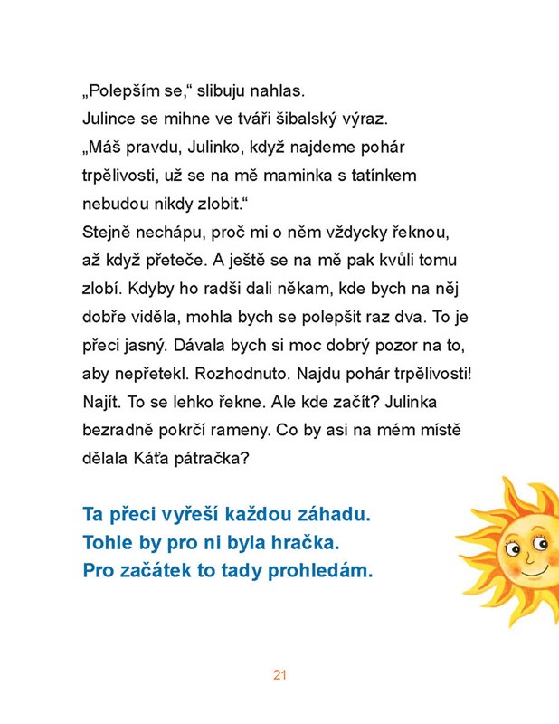 Když malá Lucinka zazlobí, rodiče jí často říkají, že pohár jejich trpělivosti už brzy přeteče. Kde ale takový pohár schovávají? Jak asi vypadá? Čím je naplněný? A opravdu hrozí, že brzy přeteče? Lucinčina zvědavost jí nedá spát, a tak se rozhodne, že záhadný pohár najde a konečně celé záhadě přijde na kloub!