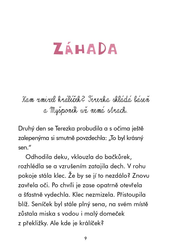 Terka je jedináček, takže když dostane za vysvědčení malého králíčka, je nadšená. Konečně bude mít doma živého kamaráda. Starat se o zvířátko ale není jen tak. Bude se muset naučit, co může jíst, vymýšlet mu zábavu, cvičit ho a postarat se o něj i ve chvílích, kdy onemocní. Terka je ale šikulka a všechno to zvládne.