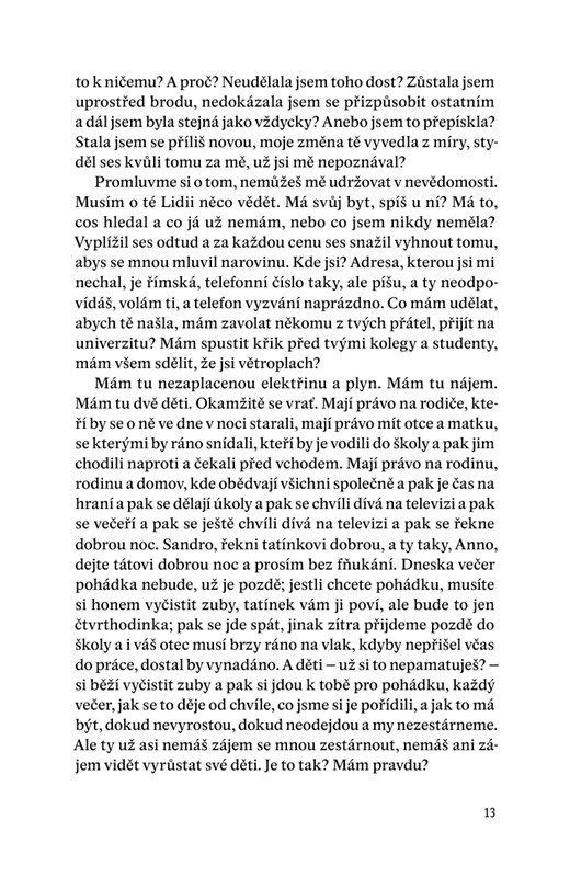 Co je to rodina a co ji drží pohromadě? Tuto otázku si nutně začne klást každý čtenář útlého, avšak strhujícího románu Domenica Starnoneho Tkaničky (Lacci). Italský název v sobě totiž skrývá do češtiny nepřeveditelný dvojsmysl: stejné slovo označuje i pasti, smyčky, oka, oprátku. Nicméně i „českou“ tkaničkou se dají jak zavázat boty, tak i ledacos sešněrovat. Je tedy tkanička symbolem soudržnosti, nebo spoutání? Příběh rodiny je v románu vypravován trojhlasně, slovo postupně dostávají opuštěná matka, záletný otec i traumatizované, nyní už dospělé děti. Každý má svou pravdu, svou vinu, svá příkoří, svoji pomstu. Jejich společný příběh se v trojdílné struktuře nerozpadá, je naopak hutný, sevřený, bolestně intimní a stahuje se jako smyčka či jako klička na tkaničce kolem jádra tvořeného úvodní otázkou. Autor jde ve výrazově silném a stylisticky střídmém textu až na dřeň, rozkládá a opět skládá tradiční rodinu v kontextu změn společenského klimatu Itálie od šedesátých let po dnešek, aby mistrně předvedl neustálé pnutí mezi nároky – osobní svoboda, realizace, štěstí – a povinnostmi, mezi sobectvím a velkorysostí, mezi prohřeškem a odpuštěním, mezi rolí viníka a rolí oběti, pnutí, které v lůně rodiny - navíc poznamenané rozkladem tradičních hodnot, sexuální revolucí a ženskou emancipací - neustále, i když často vskrytu probíhá.