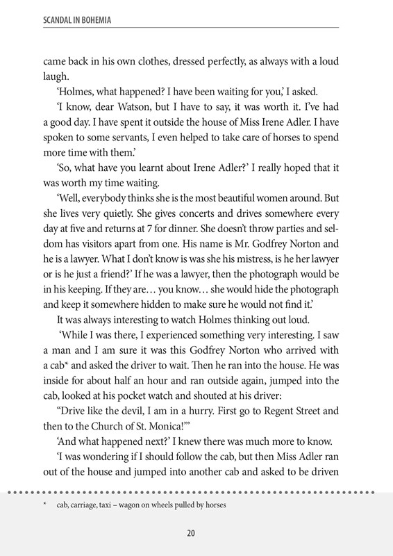 Publikace nabízí čtyři příběhy Sherlocka Holmese, které jsou určeny mírně pokročilým studentům angličtiny. Zájemci se díky nim nejen seznámí s případy, v nichž věhlasný detektiv rozehrává své brilantní logické myšlení, ale také si procvičí angličtinu. Český zrcadlový překlad umožní zkontrolovat, zda cizojazyčnému textu správně porozuměli. Na konci knihy jsou zajímavé informace o Sherlocku Holmesovi.