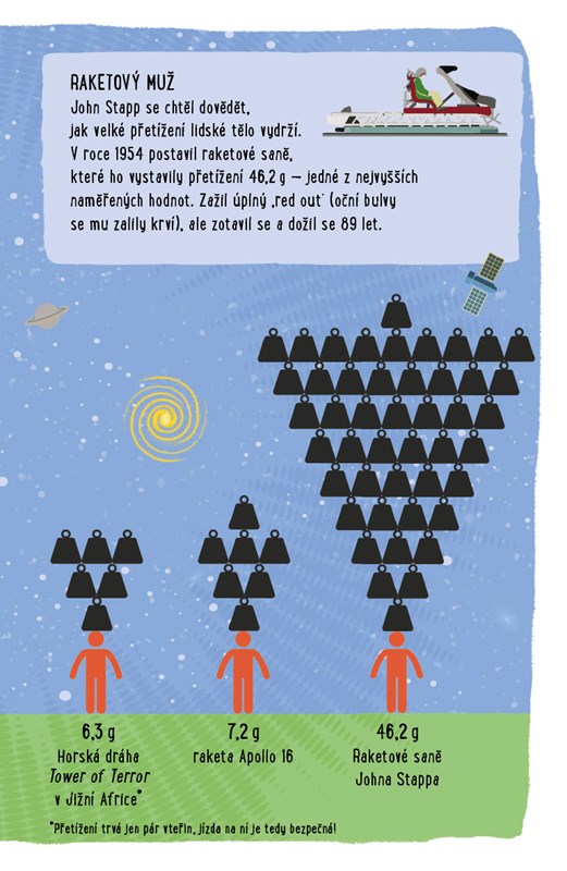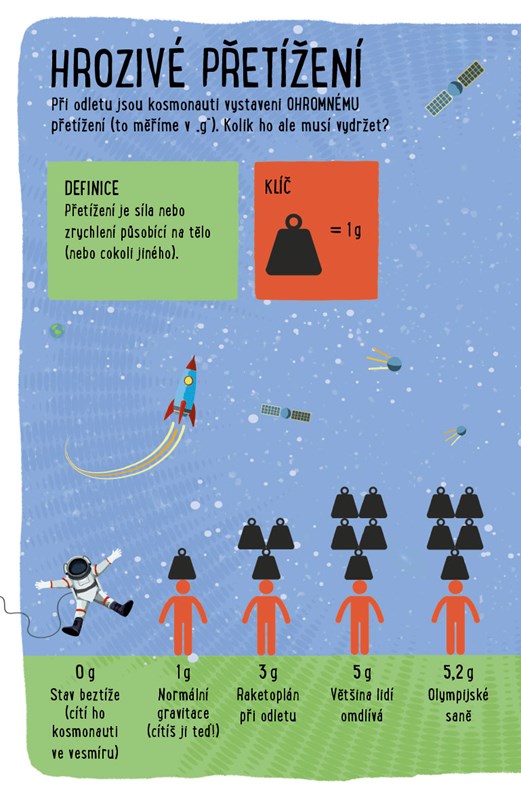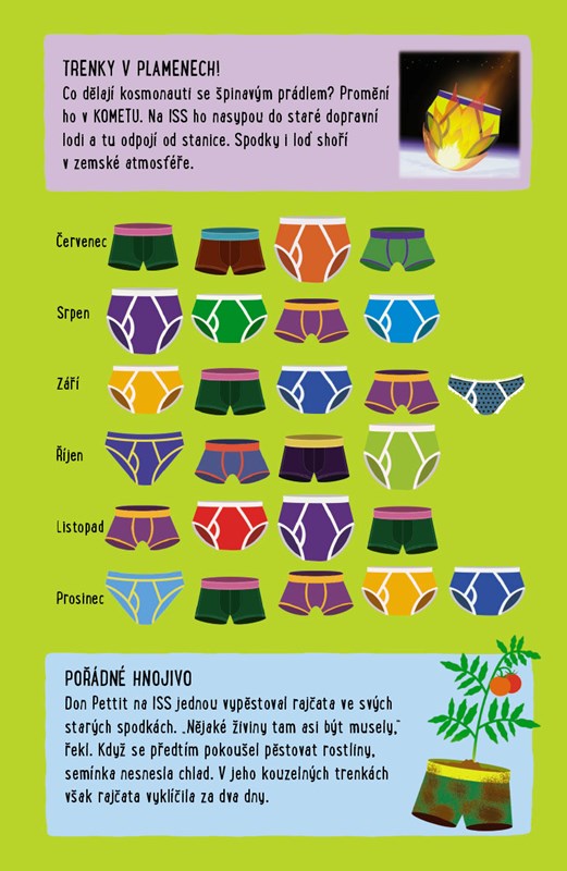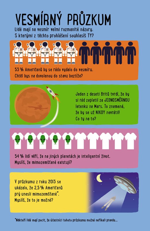 Zjistíš, jaké počasí je na planetě Pluto. Přečteš si, kolik tun odpadků zanechal člověk na Měsíci nebo kolik balonků naplněných héliem by tě vyneslo do nebe. Dozvíš se, kolik cesta do vesmíru stojí a jak chodí kosmonauti ve stavu beztíže na záchod.