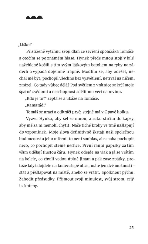 Když dojdete až na konec slepé ulice, máte dvě možnosti, přešlapovat na místě, anebo se vrátit. Třiatřicetiletá Eliška se rozhodla pro návrat. Zpátky na jižní Moravu. Do svého dětského pokoje. K rodičům. K sobě samé. Ke své podstatě. Protože doma jsou odpovědi.
