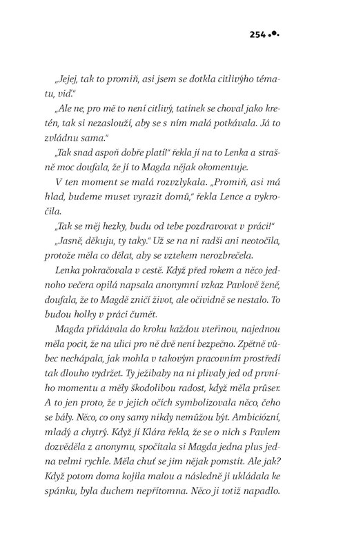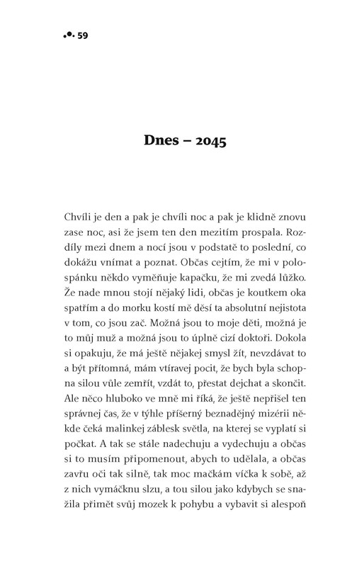 Píše se rok 2045, Barbora leží v nemocnici s diagnózou, která ji připravuje o poslední vzpomínky na minulost, lásku i rodinu. Důkazem, že skutečně žila, jsou hlavně její děti – nejistý Michal a suverénní Magda, která už stihla rozprodat matčin majetek. Díky novému léku se ale Bára pomalu vrací. Přes dvacet let vzdálené zážitky získávají jasnější kontury a současná Bára stojí před odhalením tajemství rozpadu své životní lásky. Vlaštovka v bublině volně uzavírá trilogii knih Markéty Lukáškové - navazuje svým příběhem na osudy postav Lososa v kaluži a Pandy v nesnázích.