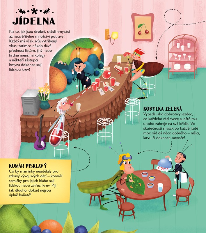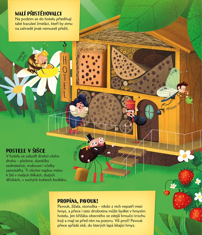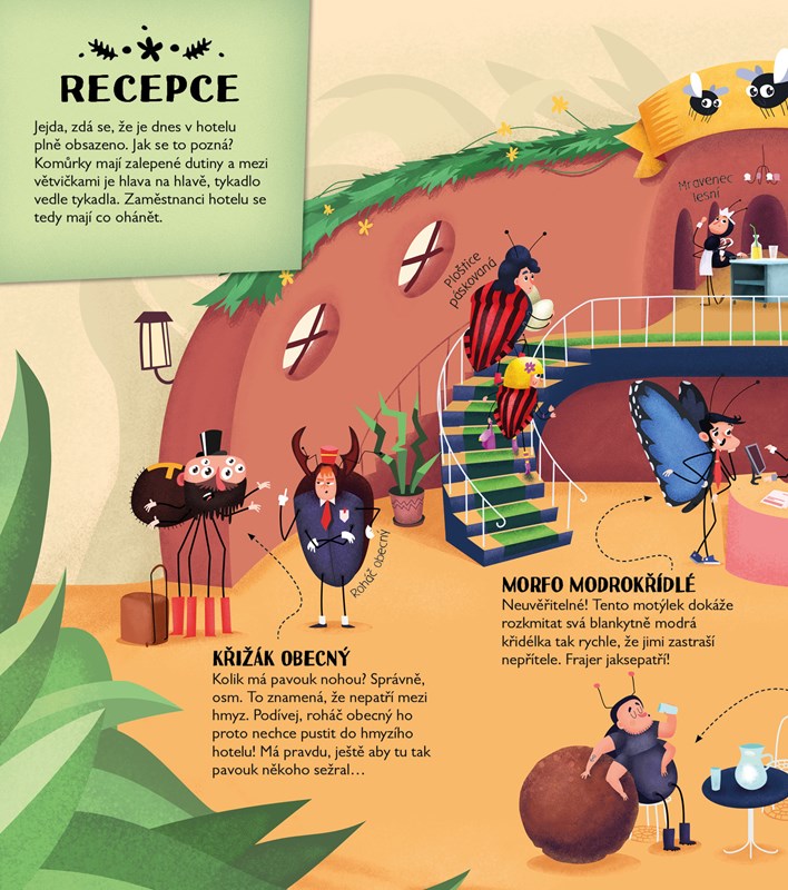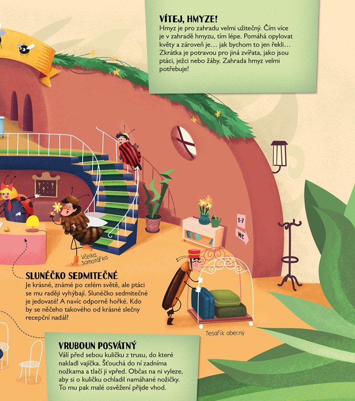 Jsou tak malí a křehcí, člověk je v přírodě snadno přehlédne. A je to škoda. Víš ty vůbec, jak barvité můžou být příběhy ze života hmyzu? Tak třeba tesařík – vypadá jako nespolečenský mudrlant, ale to způsobují jen jeho velmi dlouhá tykadla, přes která se k němu nikdo nemůže moc přiblížit. Anebo vážka – jak to, že nespadne, i když křídly mává tak zřídka a ledabyle? Jiný hmyz by už dávno spadl! A tak dále a tak dále… Svět hmyzu je skutečně podivuhodný. A proto už neotálej. Otevři tuto knihu, vstup do hmyzího hotelu a poznej zblízka jeho křehké hosty s tykadly a krovkami. Recepční slunéčko sedmitečné už na tebe netrpělivě čeká a nervózně ťuká tužkou do stolu…