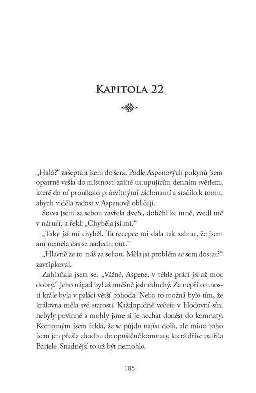 Do Selekce vstoupilo 35 dívek. Nyní jich je již jen šest, ale soutěž o srdce prince Maxona je tvrdší než kdykoli předtím. A k tomu všemu se America nemůže rozhodnout, po kom vlastně touží. Je to Maxon, s kterým by mohla žít jako v pohádce? Nebo Aspen, její první láska?
