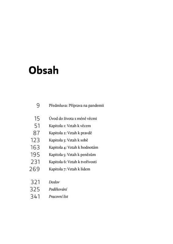 Nikdy dřív v historii nebyli lidé tolik zahlceni věcmi jako dnes. Často kvůli tomu zanedbávají své blízké. Světově proslulá dvojice The Minimalists v této knize zkoumá, jak se nám život a vztahy zlepší, poté co se zbavíme materiálních přežitků. Především ale ukazují, jak přehodnotit a napravit sedm důležitých oblastí našich životů: vztah k věcem, pravdě, sobě, penězům, hodnotám, tvořivosti a lidem. Vycházejí přitom z vlastních zážitků i zkušeností dalších zastánců minimalismu a předkládají čtenářům praktický návod, jak žít plnohodnotně a smysluplně.