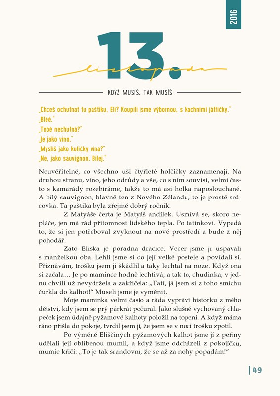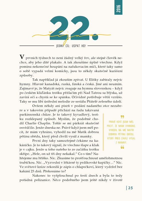 „Od sestřičky dostávám roušku, bílou gumovou obuv, zástěru a hodně široké zelené kalhoty. Kačenka už leží na sále a já usedám k její hlavě. Prakticky vzápětí se to stane. Matyáš je na světě a já si pozvolna uvědomuju, že jsem dvojtáta,“ nadšeně popisuje sportovní moderátor Vojtěch Bernatský. Nevšední příběhy všedních dnů v podání dvojnásobného otce, který slasti i strasti spojené s dětmi prožívá po čtyřicítce. A je zřejmé, že ho to jaksepatří baví!
