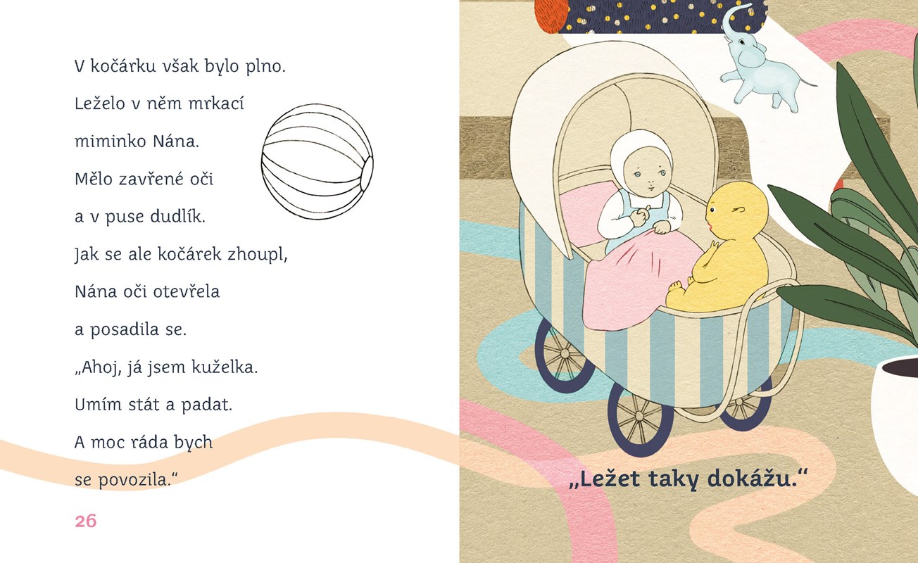 I hračky si chtějí hrát, a dokonce samy! V jednom pokojíčku byla spousta hraček, s kterými se obvykle bavily děti. Žlutá kuželka se však jednoho rána probudí a zjistí, že ostatní kuželky zmizely. Hledá je v krabici, na polici, ve skříňce, až vyskočí na parapet a vidí děti nasedat do auta. A z jejich výletních batůžků vykukují kamarádky kuželky. Žlutá se rozpláče, zapomněly na ni. Co si jen takhle opuštěná počne? Vtom něco cinkne, objeví se Kašpárek – a zahrají si spolu v loutkovém divadle. A už je tu Zlatka, zlatovlasá panenka. Za ní zavrže houpací kůň – hop! a kuželka mu sedí na hřbetě. To je krása, houpat se! Potom kuželka skočí do kočárku k mrkacímu miminku a rozjedou se pokojíčkem. Náhle zahouká autíčko a uhání s kuželkou kolem stolu. Kuželka si pohraje s kostkami, proletí se s papírovým drakem a objeví i menší kuželky – figurky z Člověče, nezlob se. Paráda! Kuželka má najednou spoustu nových přátel, už nemusí být vůbec smutná.