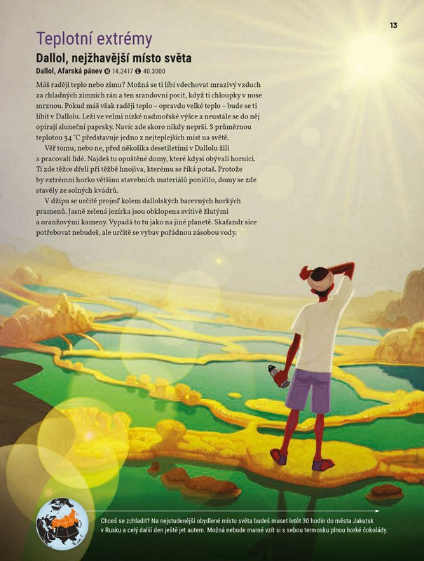 Přidej se k nám na cestu kolem světa. Zúčastni se dobrodružných expedic, které prozkoumávají 100 neuvěřitelných míst na naší planetě. Sestup do třpytivé jeskyně obřích krystalů v Mexiku, navštiv ve Vietnamu největší jeskyni na světě nebo vykoukni z Ďáblova bazénu, který se tyčí nad 108 metrů vysokým vodopádem v Zambii. No a na Antarktidě můžeš rozluštit záhadu krvavého vodopádu. A to je teprve začátek! Tato kniha je tvou letenkou do světa skrytých možností. Tak na nic nečekej, sbal si batoh a vydej se na cestu za dobrodružstvím!