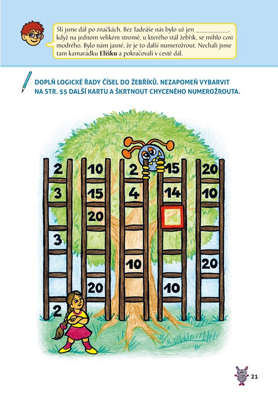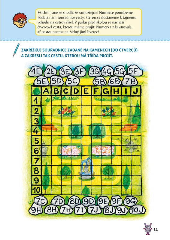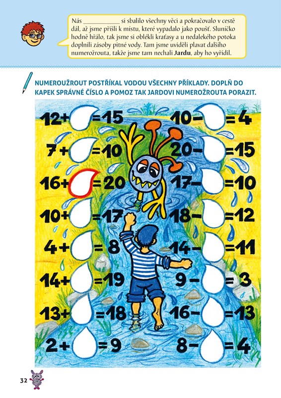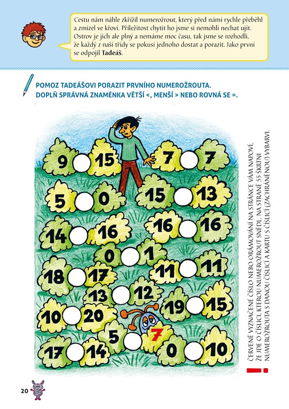 V publikaci si děti zábavnou formou procvičí základní matematické učivo 1. třídy. Spolu s hlavními hrdiny prožijí dobrodružnou výpravu na neznámý ostrov a zopakují si počítání do 20, porovnávání čísel do 20, posloupnost číslic, rozklad čísel, určení počtu a geometrické tvary.