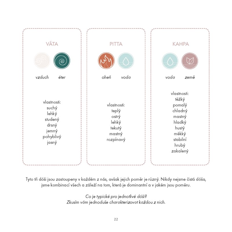 Jádro knížky pak tvoří kapitolky věnované jednotlivým ročním obdobím, kde autorka rozepisuje co cvičit a jíst a pít na jaře, v létě, na podzim či v zimě v souvislosti s tím, jak se mění fungování našeho těla během roku. Pozice vhodné pro jednotlivé roční období jsou doplněny popisy a fotografiemi. Nechybí zde ani lákavé recepty na harmonizující pokrmy.