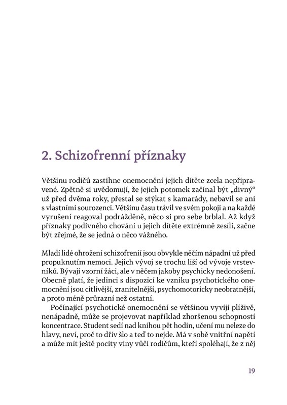 Tato „edukační příručka“ pro pacienty se „schizofrenií“ je odlišná od všech předchozích. Tzv. edukaci totiž potřebují nejenom naši pacienti a jejich blízcí, ale i psycho-odborníci (psychiatři, psychologové a další) a jiní lidé pracující v tzv. pomáhajících profesích (sociální pracovníci, ergoterapeuti…). MUDr. Martin Jarolímek v knize odpovídá na otázky o schizofrenii, líčí její příznaky a zabývá se různými aspekty léčby i běžného života. Zároveň oslovuje sociální pracovníky a terapeuty a věnuje se i obecnějším úvahám o systému psychiatrické péče v České republice. V závěru knihy najdeme seznam doporučené literatury a kontakty na sociální a jiné služby pro pomoc lidem s psychotickou poruchou.