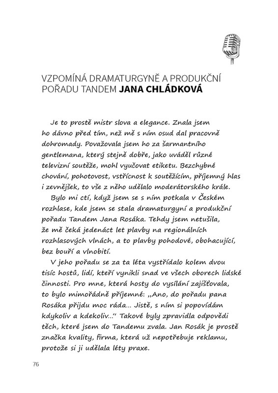 Při zaslechnutí jeho jména se automaticky vybaví názvy úspěšných pořadů jako Videostop, Magion, Dobré jitro, Meteor nebo Šťastnou cestu. Jan Rosák se stal žijící legendou rozhlasového i televizního světa. Charizmatický moderátor působí na mediální scéně již padesát let a stále ho „baví bavit“. Ve své obsáhlé biografii vzpomíná nejen na léta za mikrofonem a před kamerou, ale také na dětství a dospívání a vyznává se ze své vášně ke sportu a k divadlu. Nechybějí ani vzpomínky blízkých lidí a kolegů i fotografie ze soukromého archivu.