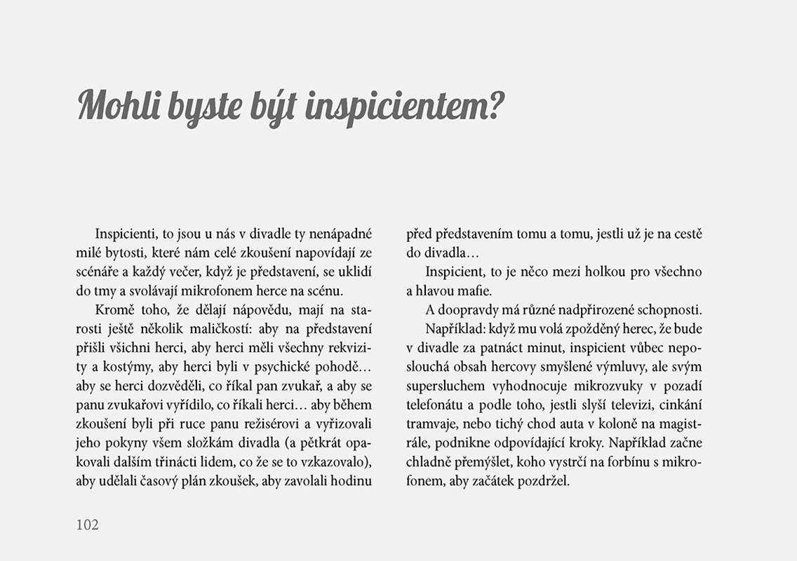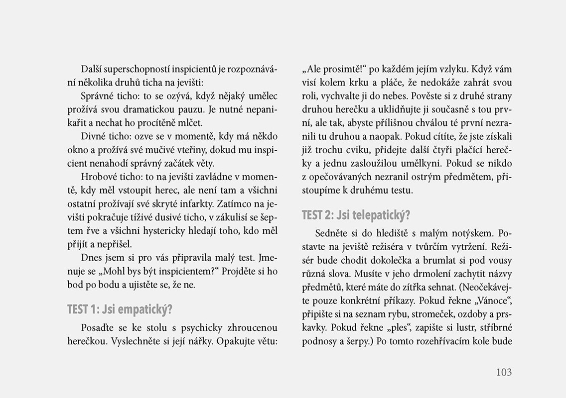 Pak už zbývá jen pár dalších předpokladů: důvěrně znát svět, o kterém píšete. Psát tak, aby se všichni aktéři popisovaných příhod poznali, a cítili se polichoceni či pobaveni, nikoli dotčeni. Musíte být vtipná a inteligentní a psát tak dobře, že vaše články vyhledávají i lidé, kteří by za jiných okolností žádný blog ani historky z hereckého zákulisí nikdy nečetli (ze zásady). A hlavně – musíte umět shodit sama sebe a dělat to s takovým šarmem a grácií, že všechny vaše chyby a trapasy budou čtenáři milovat.