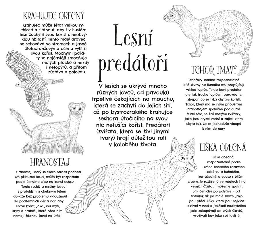 V této krásné knížce najdeš 24 ilustrací s lesními náměty, které můžeš vybarvovat podle vlastní fantazie, a taky fascinující informace o některých z divokých zvířat či rostlin, která jsou na obrázcích.