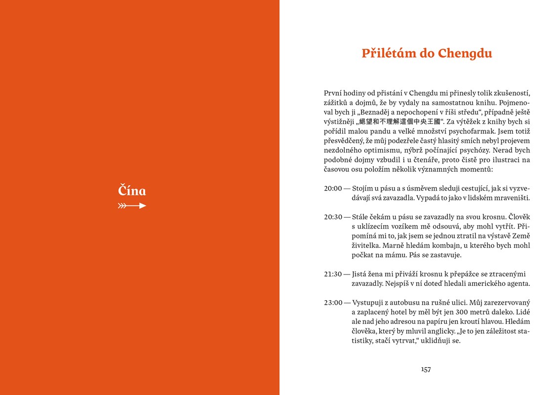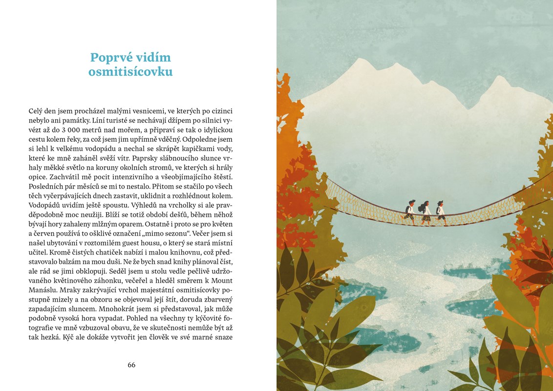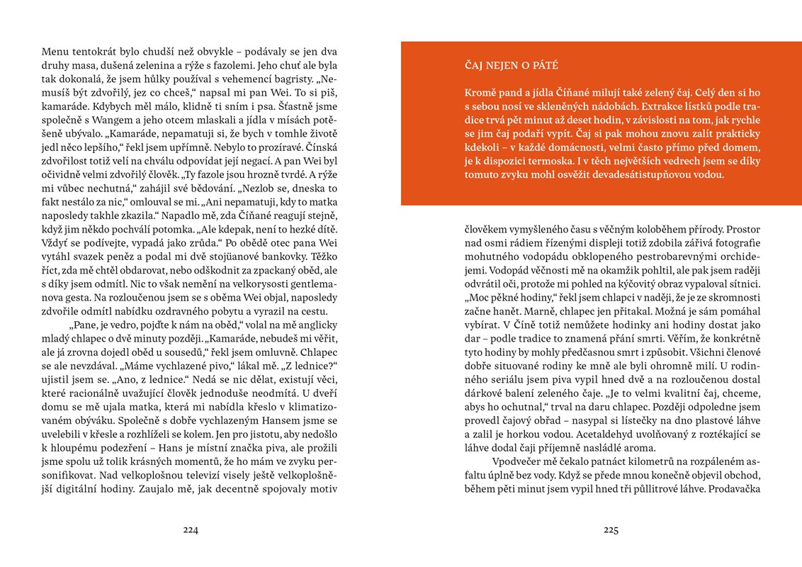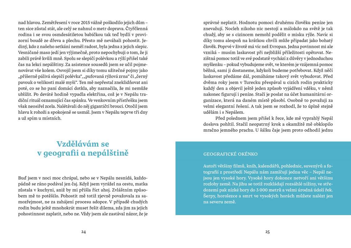 Když mi byly tři, rozbil jsem si hlavu o bidet. Když mi bylo devět, rozbil jsem si hlavu o kolo, které jsem vedl do kopce. Myslím, že bych vůbec neměl cestovat, protože jsem hrozně nešikovnej. Ale stejně to dělám. Radši ale chodím pěšky, protože tak je to nejbezpečnější. Jednoduše vyrazím na cestu a čekám, co mě tam potká. Tentokrát jsem se vydal do Číny a Nepálu. V kraťasech ze supermarketu a brýlích z drogerie jsem prošel Himálaj i úplně neznámé vesnice v údolích řek. Mnohokrát jsem spal u úplně cizích lidí doma a poznával, jak se jim doopravdy žije a co jim přináší štěstí. Už na cestě jsem o nich začal psát tuto knihu. Času na psaní byl dostatek, protože ujít pěšky 1 500 kilometrů trvá docela dlouho. Jak si teď po sobě knihu čtu, myslím, že se mi povedlo vytvořit pěkné svědectví o jednoduchosti života a půvabu svobody. Jestli se chcete dozvědět něco o památkách a historii, radši si ji ale nekupujte. Kniha je jen o Číňanech, Nepálcích a jejich životě. A taky trochu o mně. Tomu se člověk nevyhne, když jde sám.