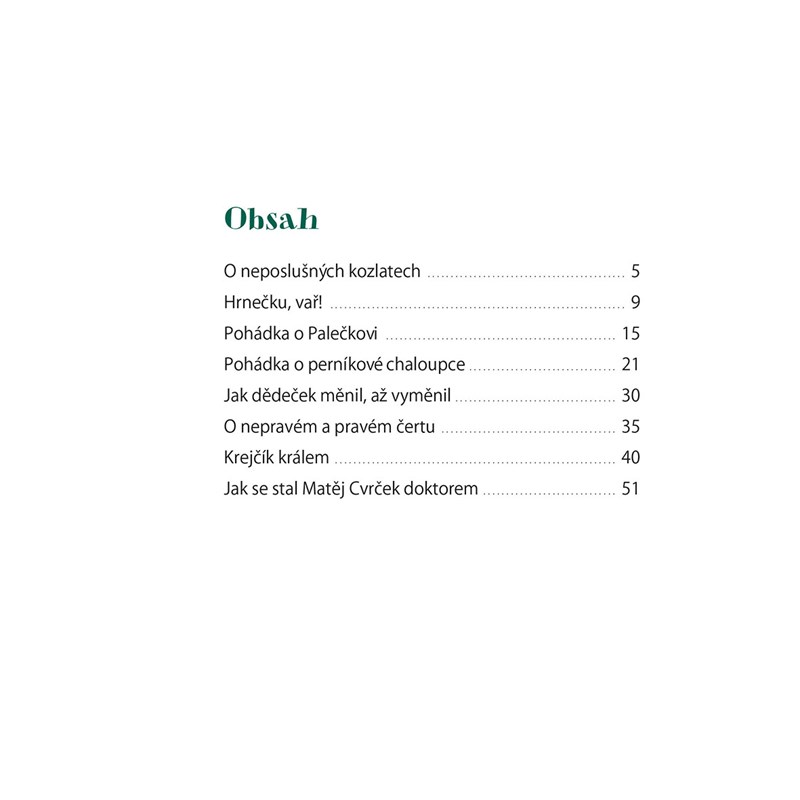 O perníkové chaloupce, Hrnečku, vař!, Krejčík králem, Jak dědeček měnil, až vyměnil, O neposlušných kozlatech, O nepravém a pravém čertu, Jak se stal Matěj Cvrček doktorem, O Palečkovi. Pohádky, kraťoučké i delší, veselé i vážné, pro malé čtenáře i starší čtenáře. Vychutnejte si jedinečné chvíle při společné četbě pohádek. Malí čtenáři mohou předčítat rodičům, text knihy včetně typografie je tomu přizpůsoben. A rodiče čekají pohádky pro náročnější zájemce o nesmrtelný žánr pohádky