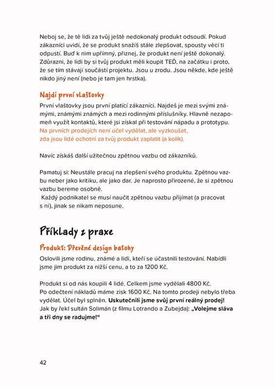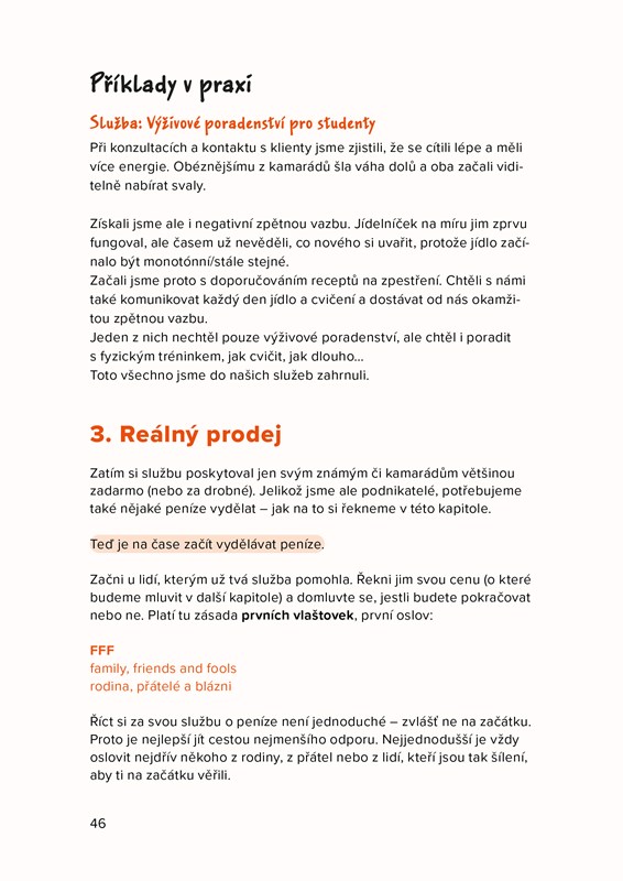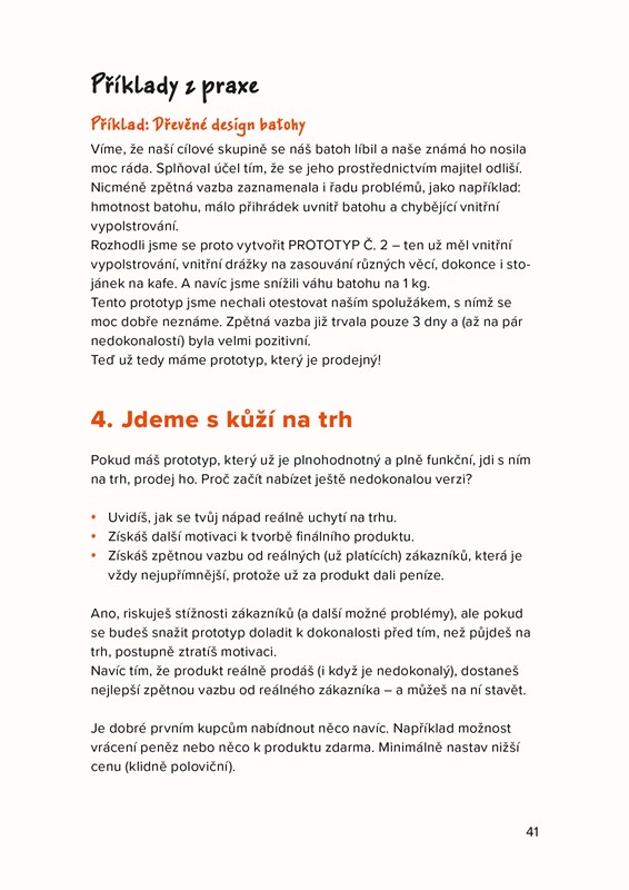 Všechny postupné kroky jsou ukázané na reálných příkladech skutečných podnikatelských projektů. Autoři počítají jak s těmi, kdo chtějí vstoupit na trh se super produktem, tak s těmi, kdo mají v hlavě nápad na skvělou službu. Všechno je pak doplněno o zajímavé podnikatelské příběhy.