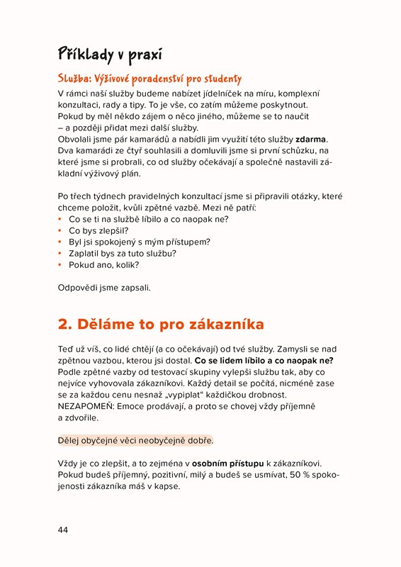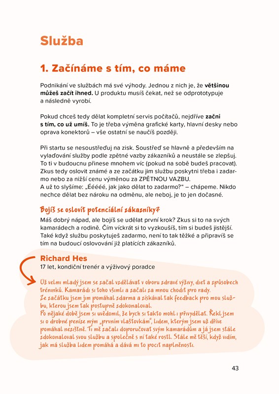 Kniha nabízí přesný návod, jak začít – od vymýšlení podnikatelského nápadu až po lákání zákazníků a prodej. Jako bonus zde najdete řadu užitečných nástrojů a odkazů, které vám pomohou při prvních krůčcích pestrým světem byznysu. Kniha je určena mladým lidem, kteří chtějí začít s podnikáním, ale ještě nemají ten pravý nápad nebo nevědí, jak svůj nápad správně „nakopnout“.