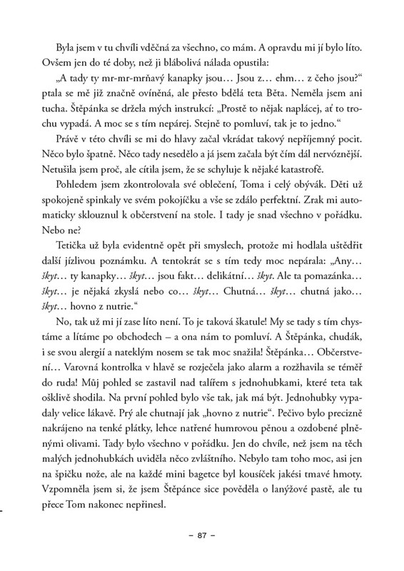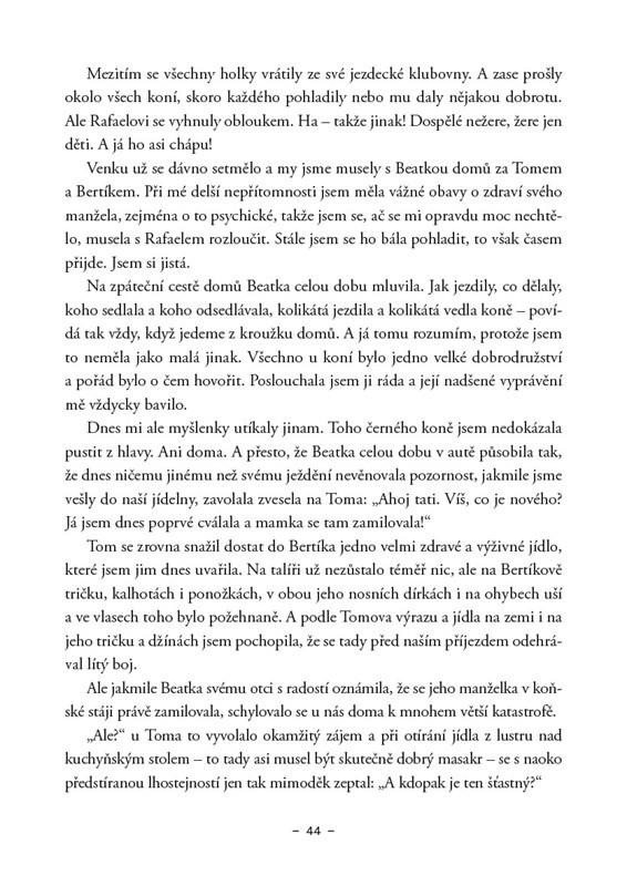 Ze života na mateřské už jí začíná jít hlava kolem, a tak nutně potřebuje změnu. Bude kýženým rozptýlením práce s malými špunty v mateřské školce nebo návrat k její dětské lásce – ke koním? Jisté je, že jedno i druhé jí přinese perné i veselé chvilky a taky důležité poznání. Uvědomí si, že i když má někdy pocit, že na ni všechno padá, má po ruce hned několik berliček, které ji vždycky podrží –milující rodinu, šílené příbuzné, nezkrotná psiska, moravský vzduch nebo třeba lásku k Miku Tysonovi.