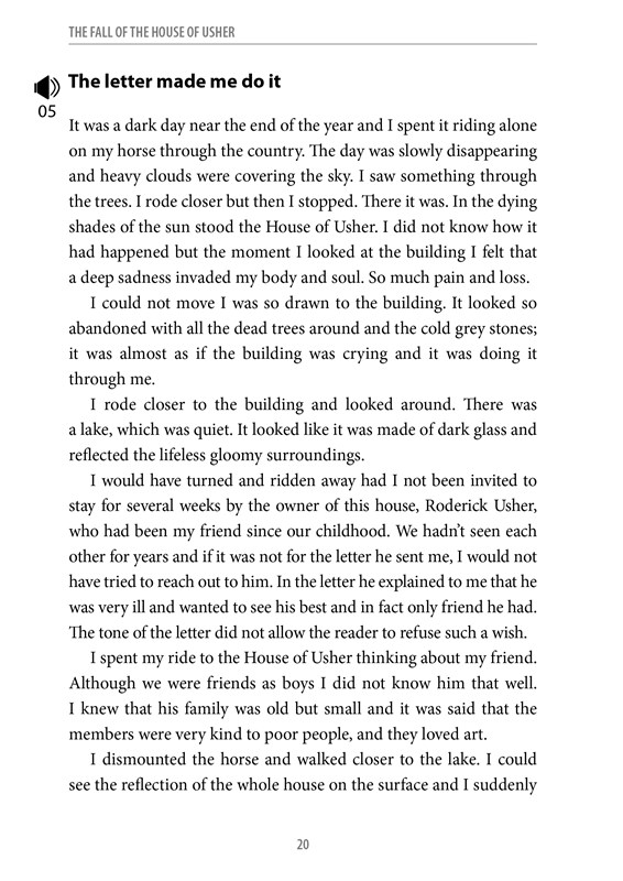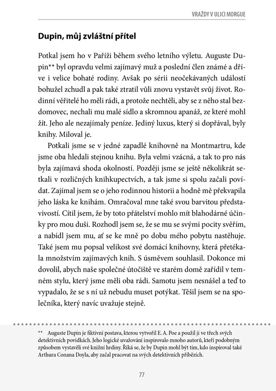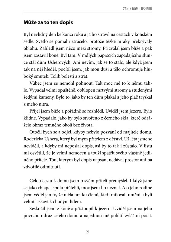 Příběhy Edgara Allana Poea, mistra a průkopníka hororové literatury, nabízejí pohled do jiné reality, temné a často děsivě nadpřirozené. Čtenáře pohltí tajuplná atmosféra, ponoří se do světa plného napětí, strachu a tajemné nejasnosti. Právě ona nevšední atmosféra láká číst díla Edgara Allana Poea znovu a znovu.