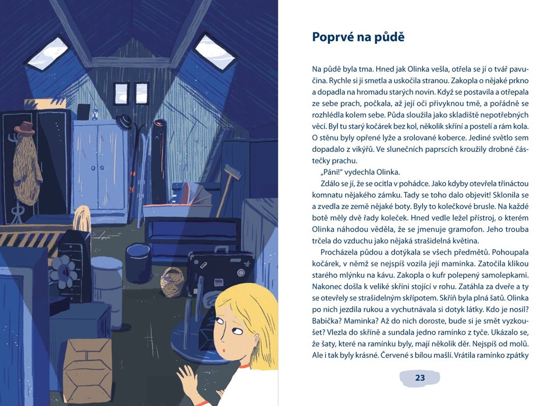 Šestiletá Olinka jede na prázdniny k dědečkovi do Vehlovic. Že by se ale těšila? O tom vůbec nemůže být řeč. Děda je pěkný mrzout a nejradši by jen chodil na ryby, díval se na televizi a jedl párky. Jednoho dne Olinka na půdě objeví tajemnou truhlu s mosazným kováním a v uzívaných Vehlovicích se konečně začnou dít pořádná prázdninová dobrodružství. Díky truhle se dívka dostane do napínavých příběhů těch nejkrásnějších knížek. Ale pozor! V knížkách čeká nejen dobrodružství, ale i pořádná dávka nebezpečí…