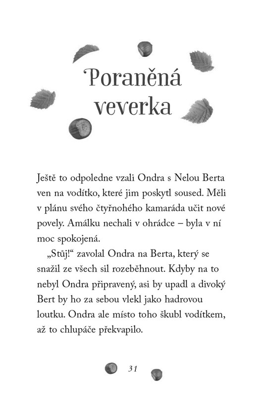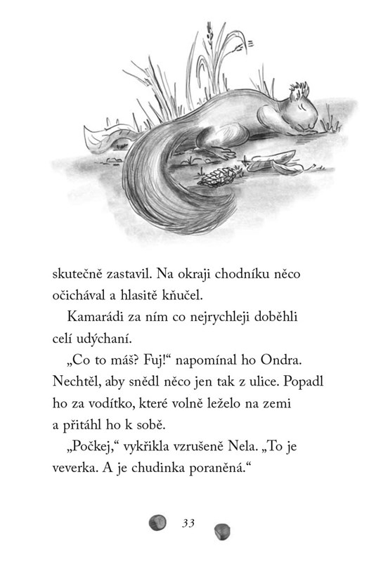Ondra a Nela najdou u silnice poraněnou veverku. Ihned poznají, že potřebuje pomoc, a tak ji opatrně odnesou do chaty, odkud Ondrův dědeček zavolá na záchrannou stanici. Tím ale celé dobrodružství nekončí. Druhý den najdou na stejném místě dvě podchlazená veverčata. Jsou to mláďata nalezené veverky? Zachrání i je?